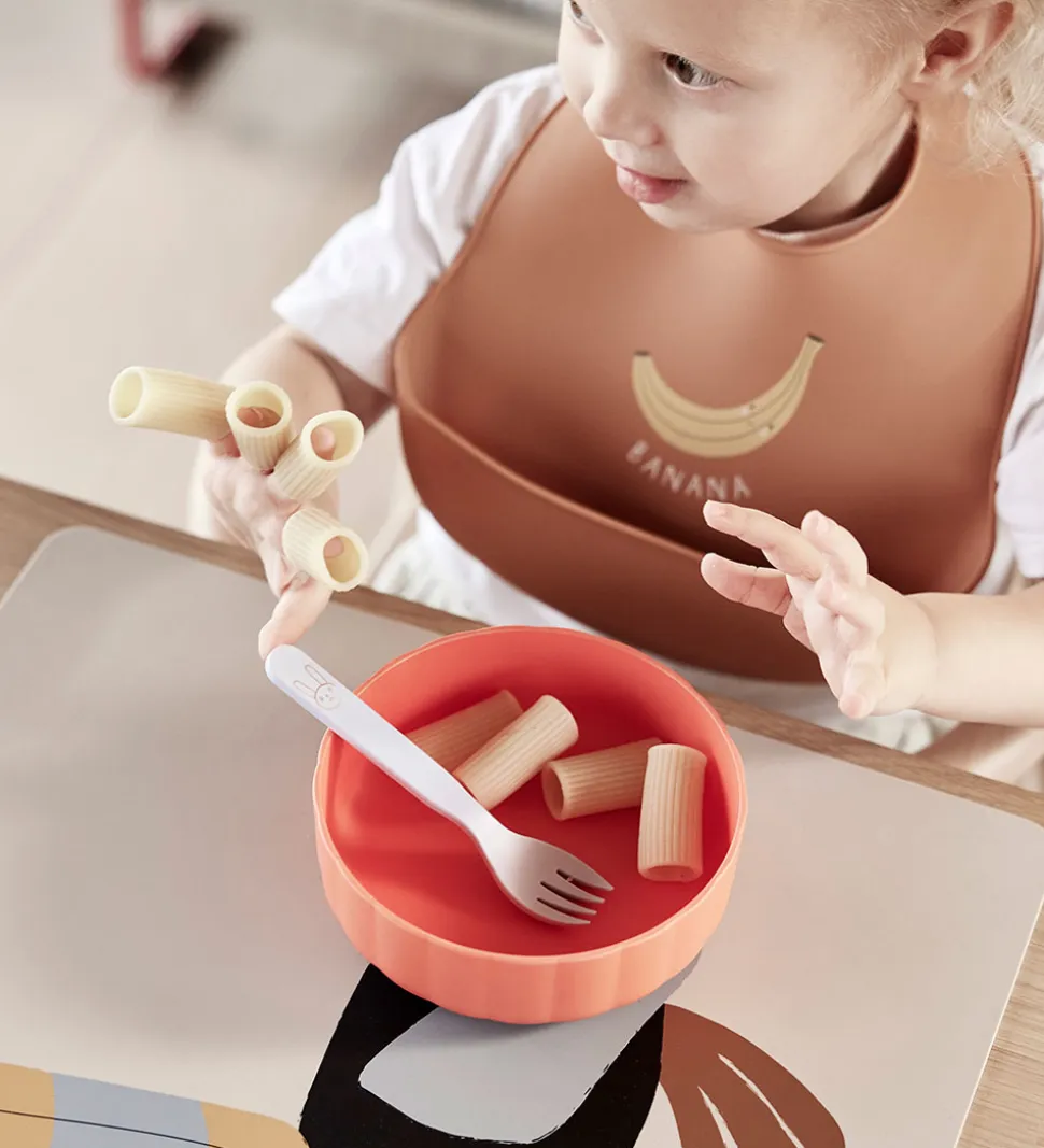 OYOY hagesmækkene har hver en praktisk lomme i bunden, som opsamler krummer og andre madrester. Hagesmækkenne knappes i nakken med et smart knap-system med flere indstillinger. Hagesmækken er lavet i fleksibelt silikone.