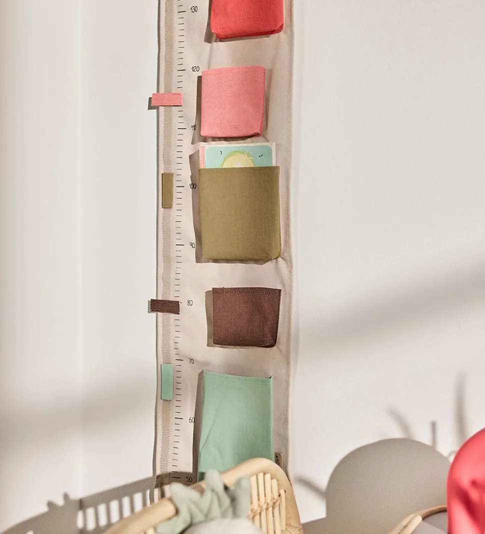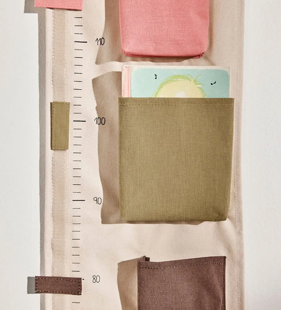 Fin OYOY højdemåler i beige med lommer i flotte farver.