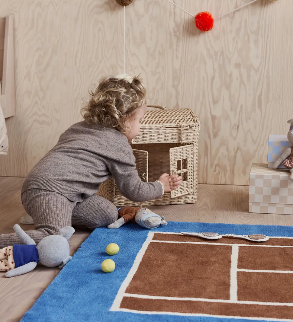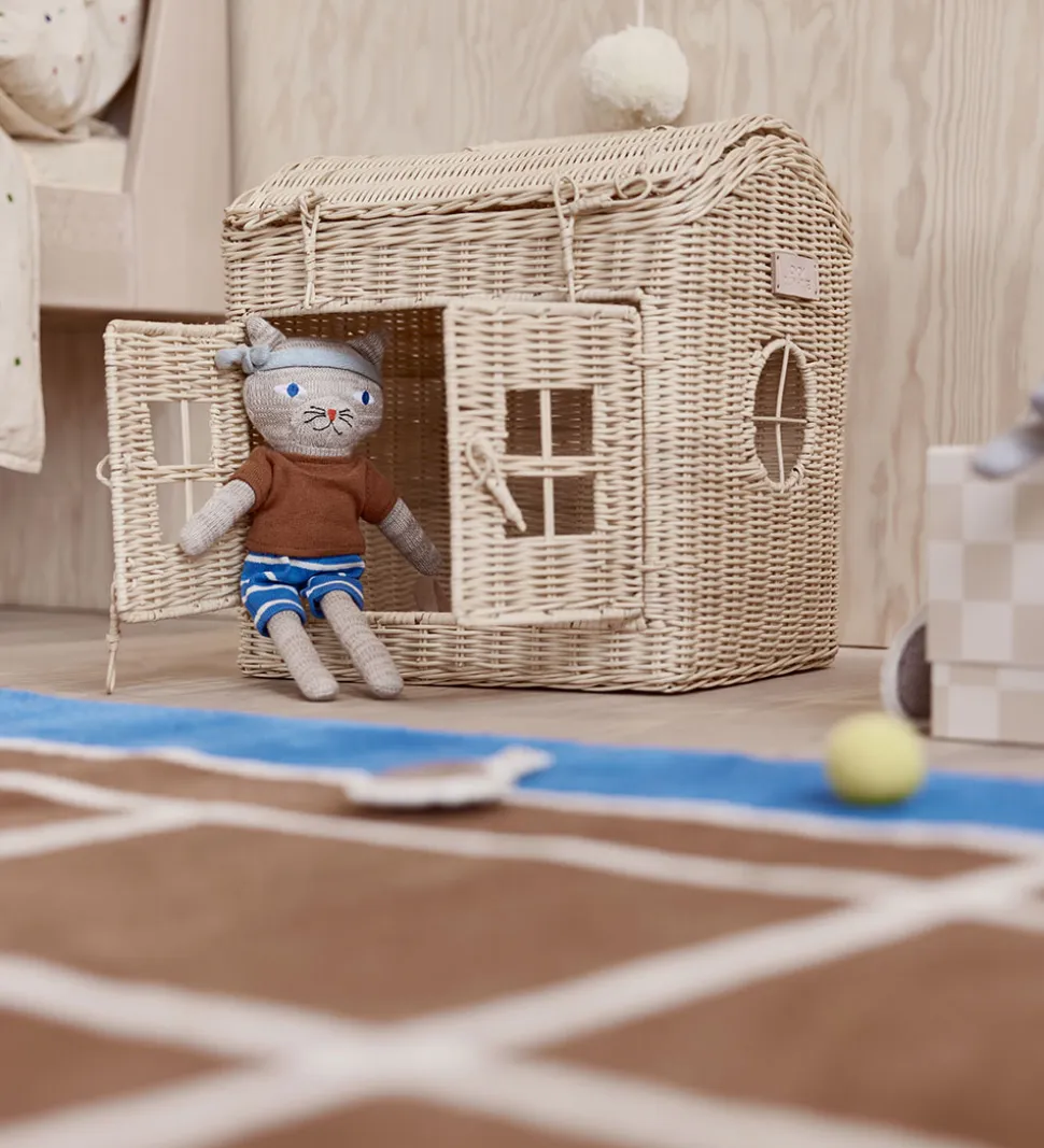 OYOY opbevaringskurven har et fint design som et hus, med vinduer og tag der kan åbnes, så det er nemt at komme til tingene. Kurven har også et håndtag i toppen, hvilket gør den nem at flytte rundt på.