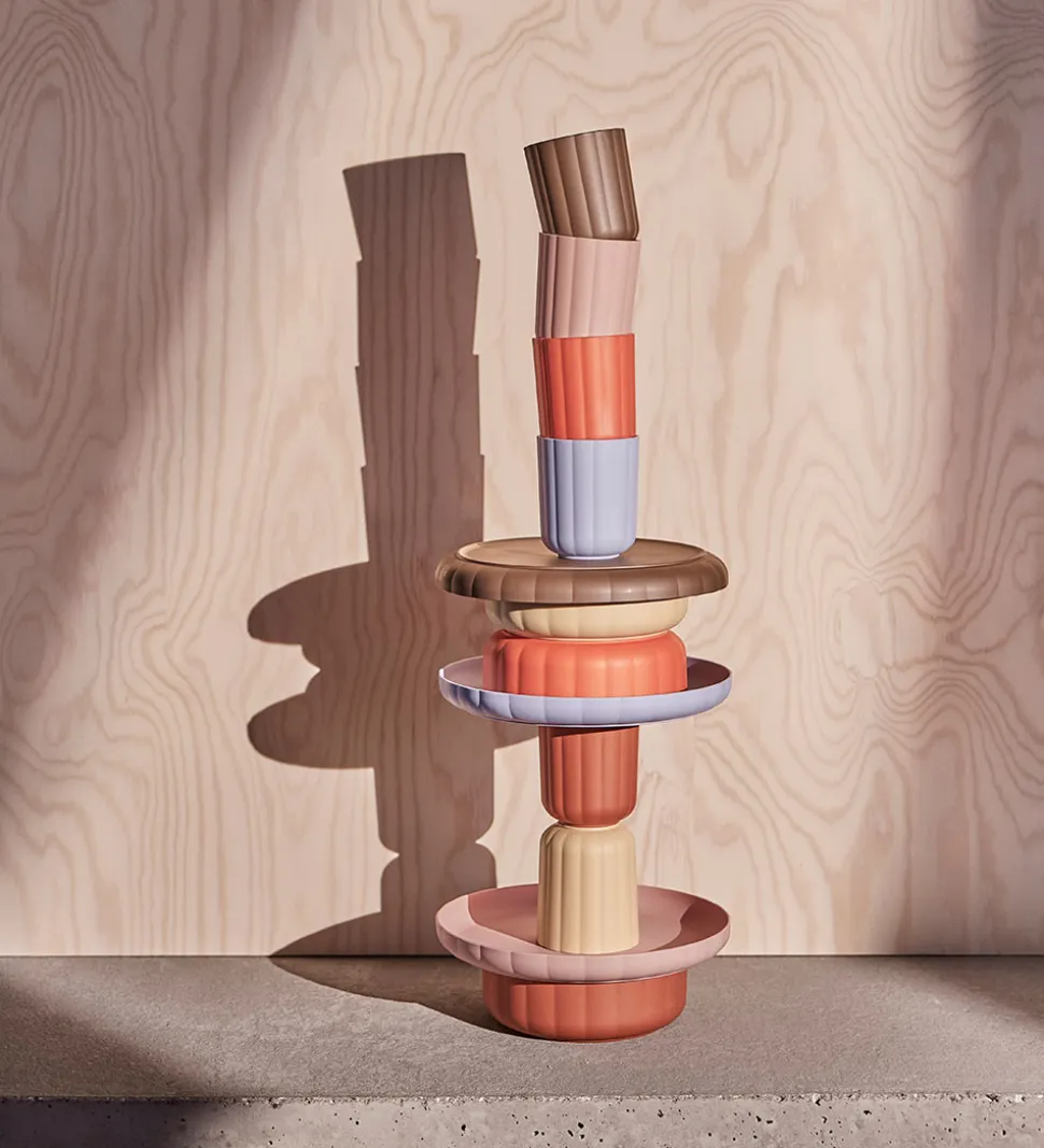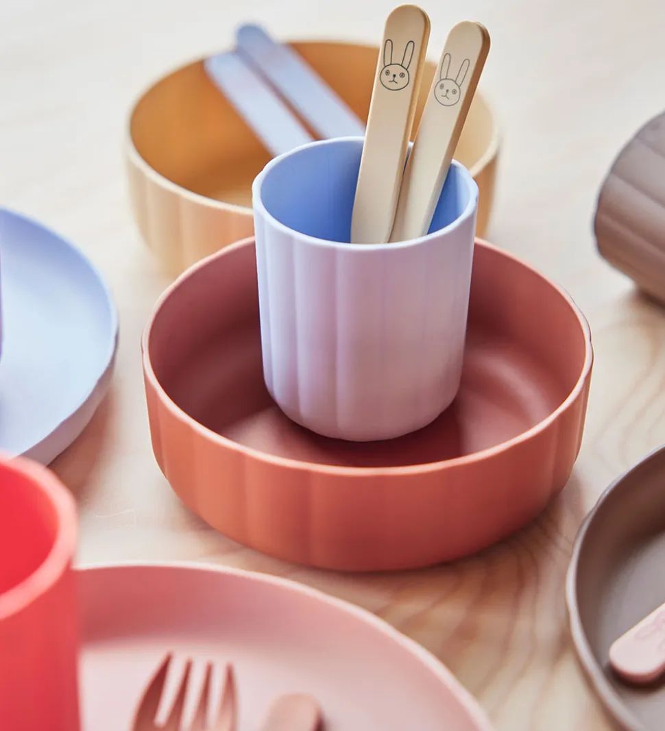 OYOY tallerkenen og skålen har en rillet struktur på ydersiden, som giver et godt greb, og de har en mat, silkeagtig overflade. Tallerkenen og skålen tåler at komme i opvaskemaskinen.