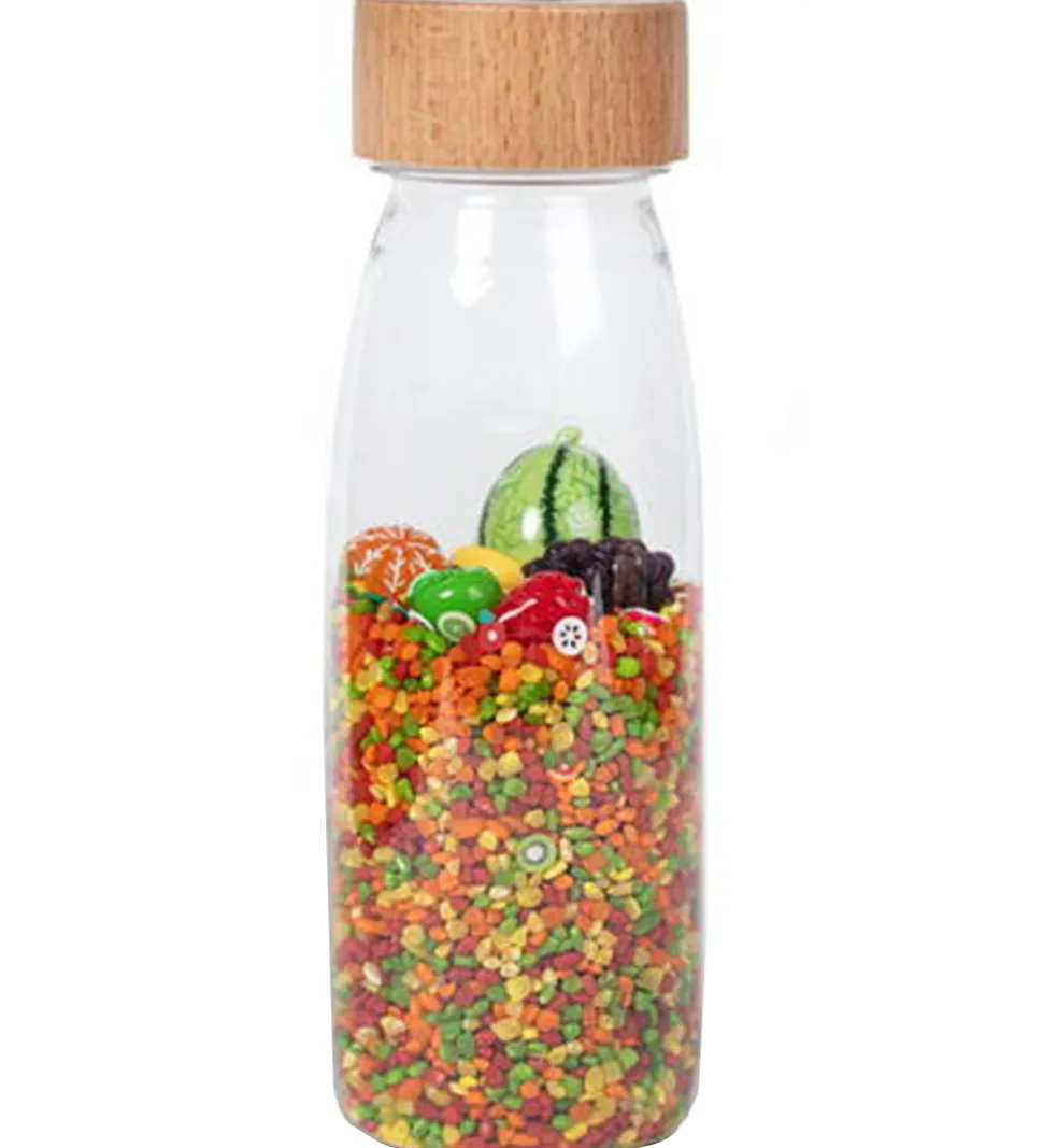 Fint Petit Boum sanselegetøj, der er formet som en flaske med et helt glat trælåg, og inden i flasken ses indholdet, som består af multifarvet konfetti, hvori der gemmer sig masse forskellige frugter.