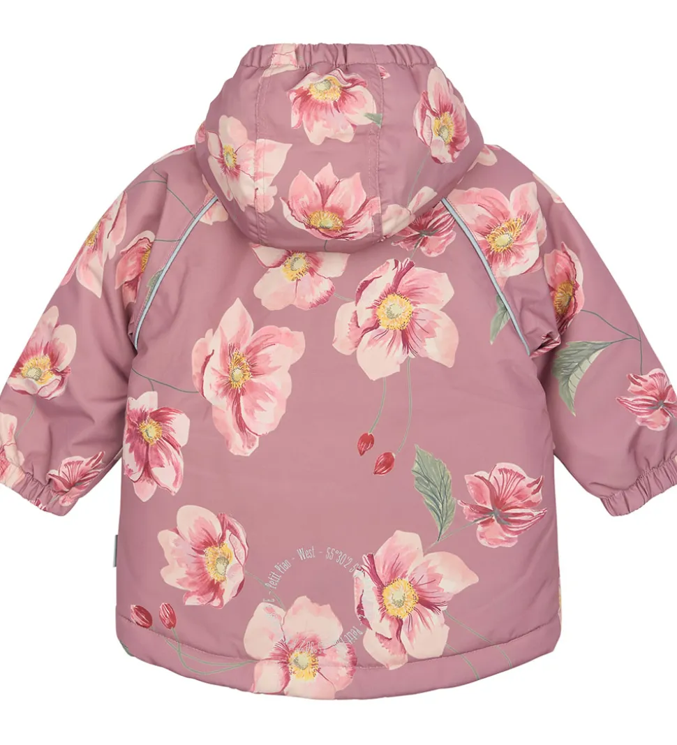Skøn Petit Piao vinterjakke i rosa med et alloverprint af efterårsanemoner. Vinterjakken er med praktiske reflekspipings og et broderet logo fortil.