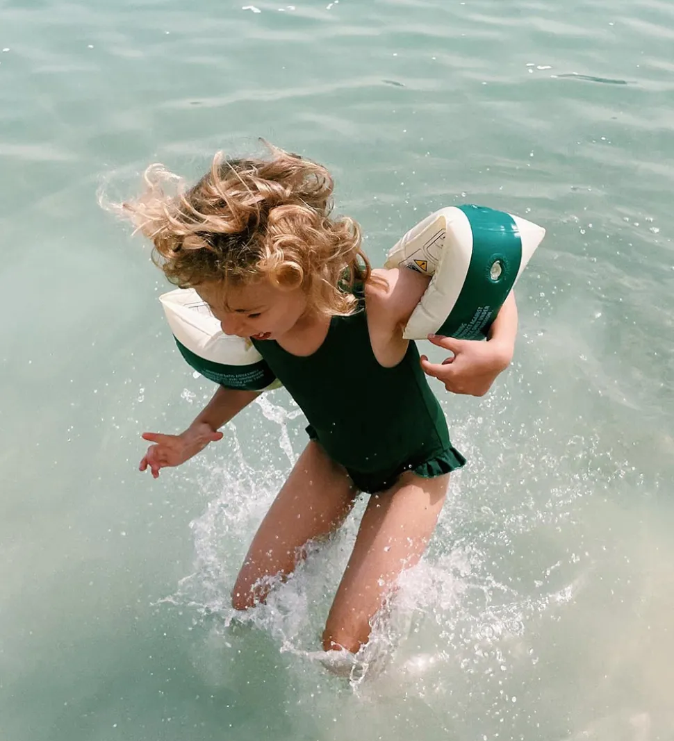 Flotte Petites Pommes badevinger i cremehvid med en bred, mørkegrøn stribe.