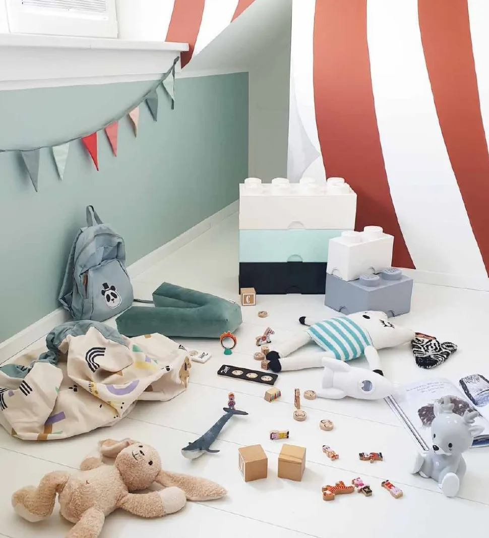 Play&Go legetøjstæppet er et stort cirkelformet stykke stof med en løbegang hele vejen rundt med en sort snor, så man kan snøre tæppet sammen til en pose. I posen kan man opbevare sit legetøj, og når børnene synes, at legetøjet skal med ind i stuen, kan posen åbnes og legetæppet folder sig ud. Bagefter er det hurtigt og nemt at rydde op og lægge på plads.