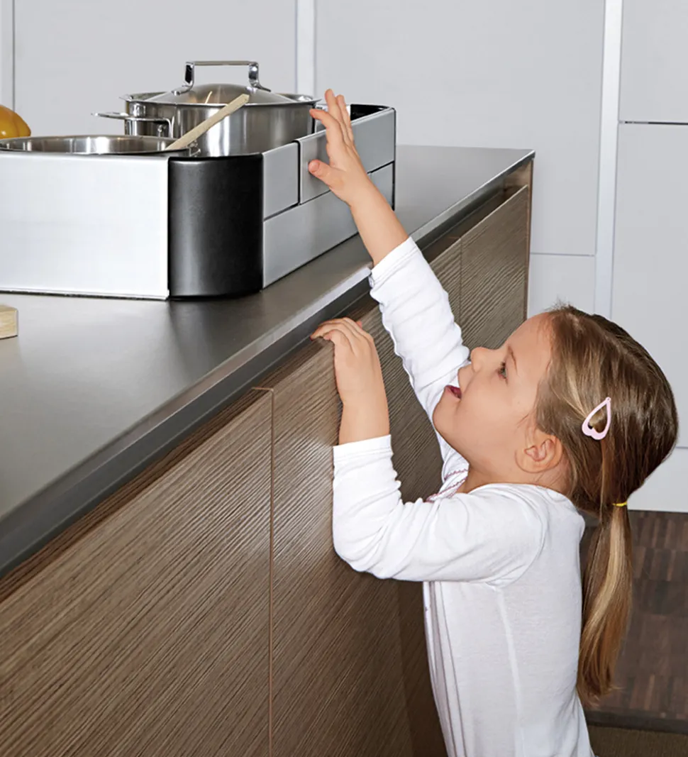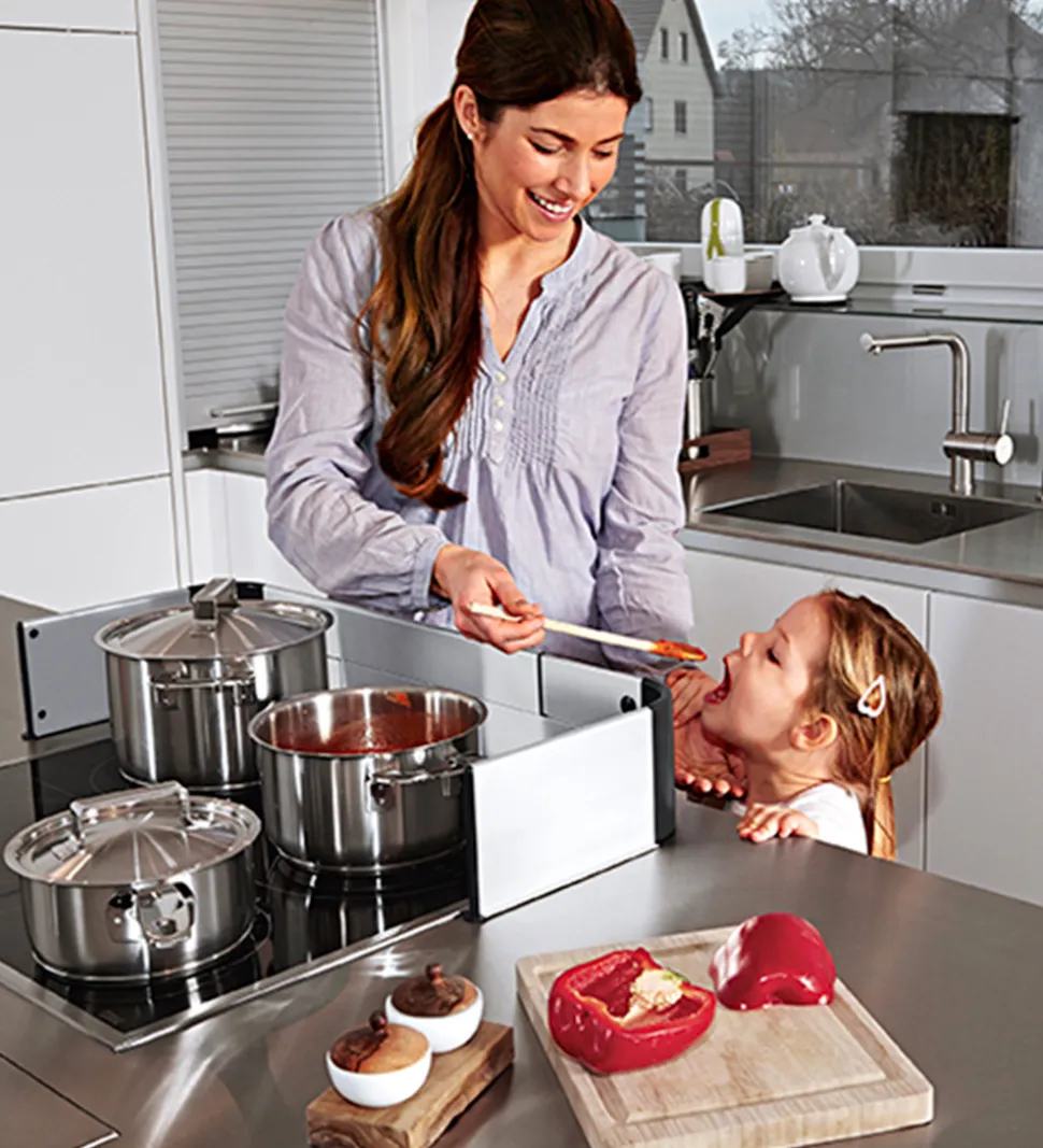 Reer komfur-beskytteren sættes foran komfuret, så de mindre børn ikke kan nå gryderne eller det varme komfur. Den kan justeres i længden, så den passer til de fleste komfurer. Delene fra komfur-beskytteren kan sættes i opvaskemaskinen, så delene nemt kan gøres rent.