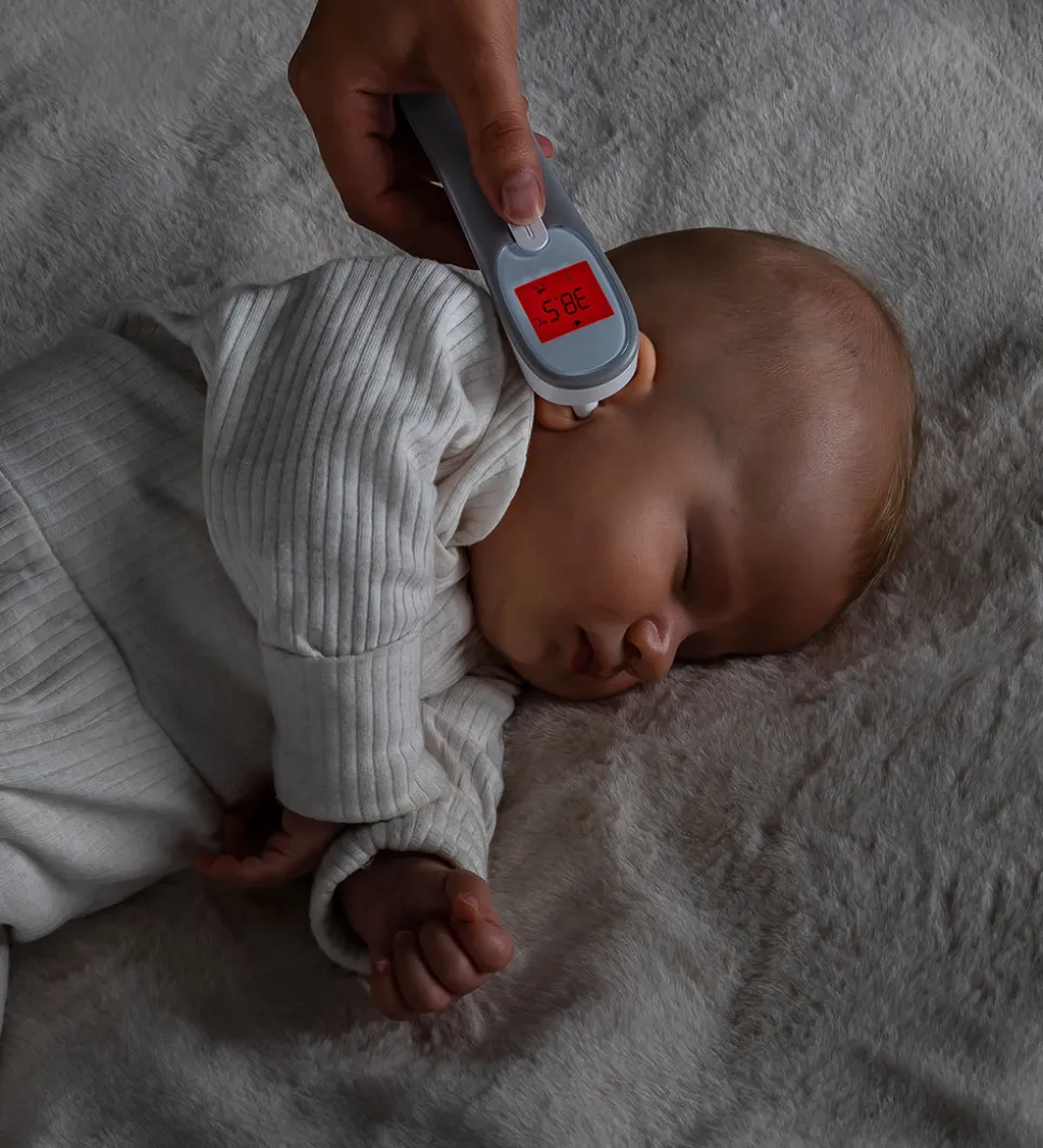 Praktisk Reer kontaktløs øretermometer i hvid og grå med et stort, oplyst display, som gør det nemt at bruge på alle tider af døgnet. Termometeret kan bruges til febermåling i øret, men kan også bruges til måling af overflade- og rumtemperatur.