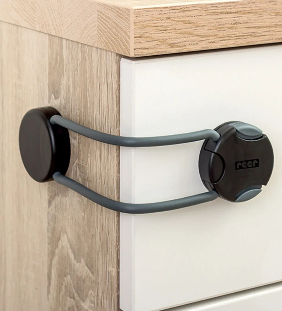 Praktisk Reer multisikring i sort som kan låse skuffer, skabe, opvaskemaskine, køleskabe og mikroovne.