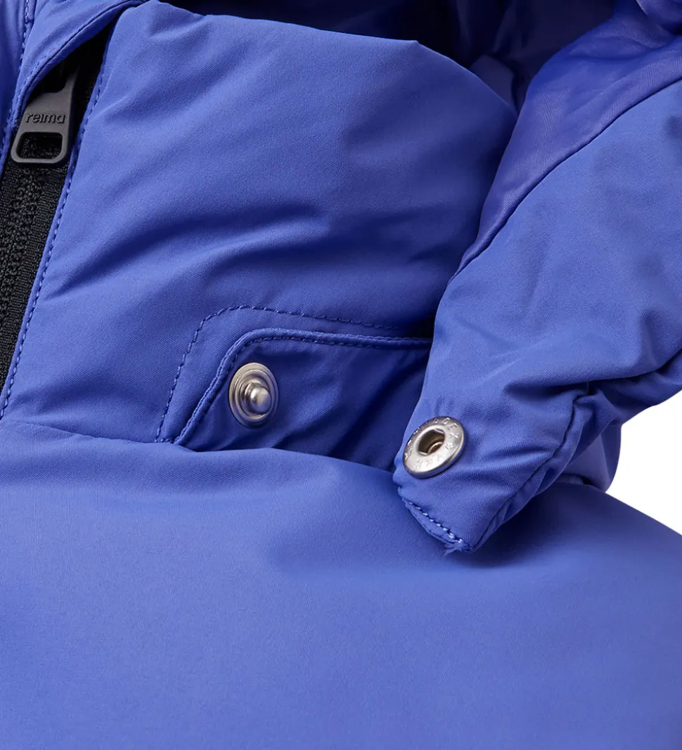 Reima dunjakken har en aftagelig hætte, som fæstnes langs den høje halskrave med skjulte trykknapper. Ærmerne har indvendige elastikanter.