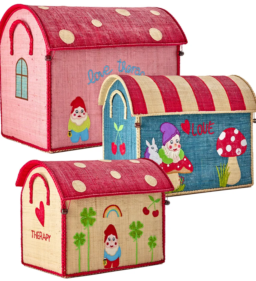 Rice opbevaringskurvene består hver især af ét stort rum med plads til f.eks. bamser, legetøj eller andet og åbnes med et fastgjort låg. Låget har snore ved hjørnerne, der hægtes på en perle, når låget skal holdes lukket.