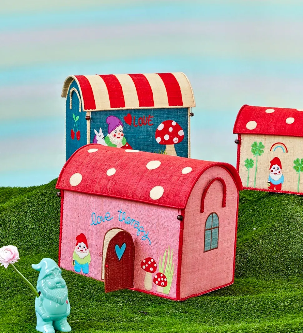 Søde Rice opbevaringskurve lavet som 3 huse, der alle er udsmykket i et “Love Therapy”-tema med flotte farver.