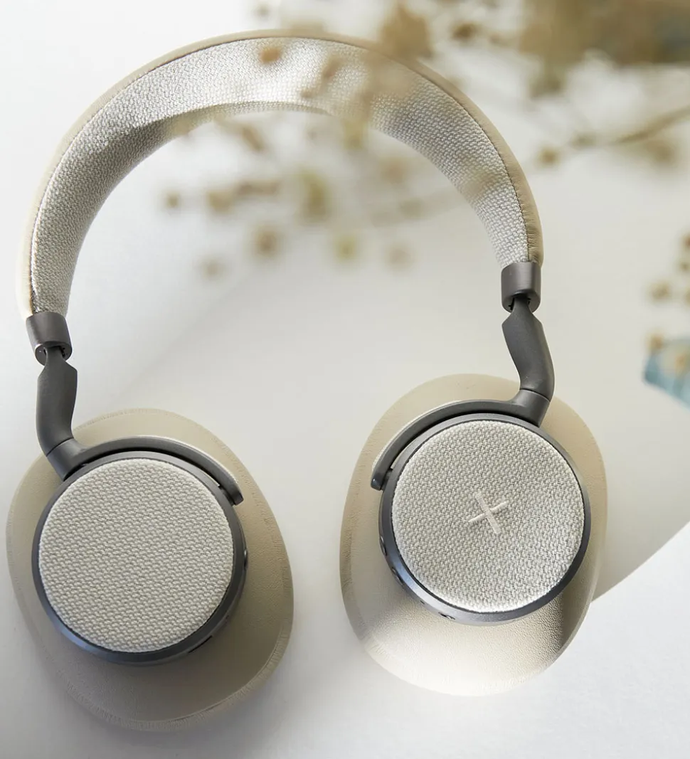 Fede, trådløse SACKit høretelefoner i beige med tekstil og imiteret læder.