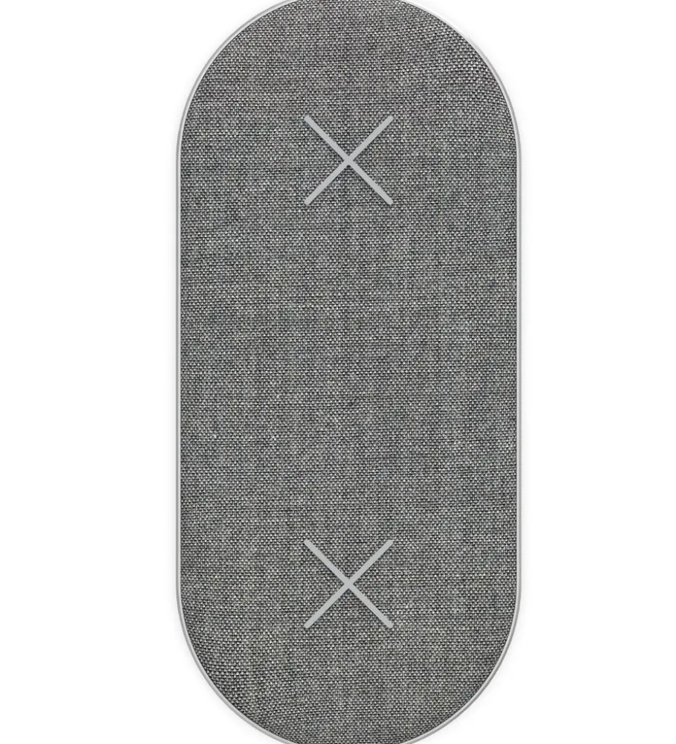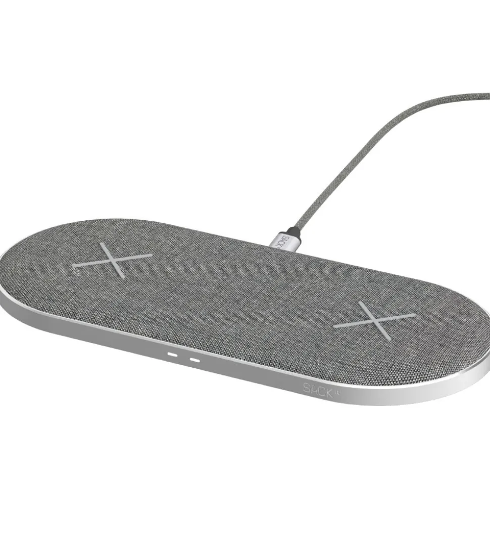 Fed SACKit oplader i stilfuldt, gråmeleret tekstil med en lækker, diamantskåret aluminiumsramme. Fortil er der et X’er i silikone, som de opladende enheder holdes på plads af.