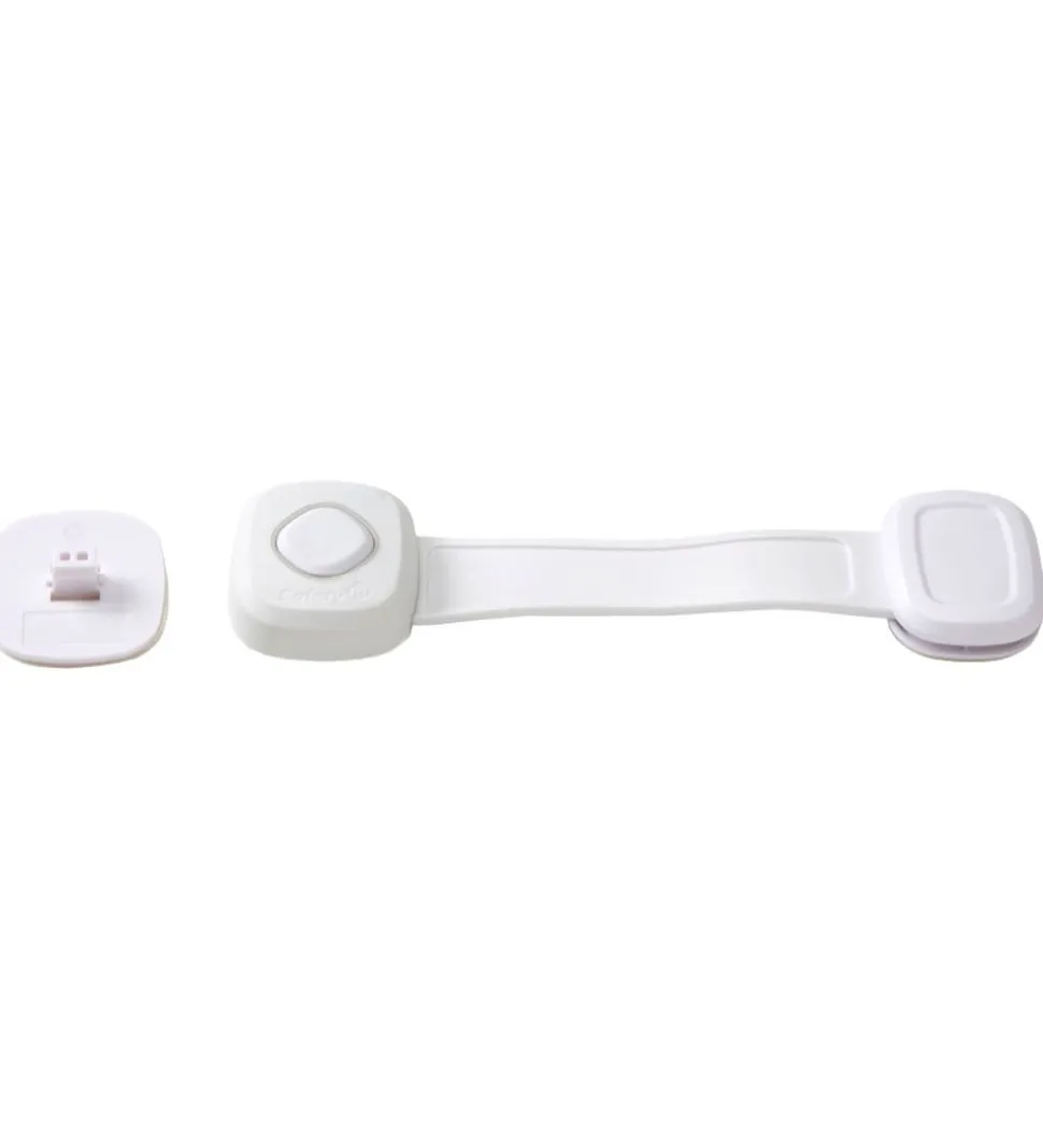 God Safety 1st multi-sikkerhedslås i hvid, med en distraherende snydeknap på den ene side, til at drage opmærksomheden væk fra den rigtige, skjulte knap.