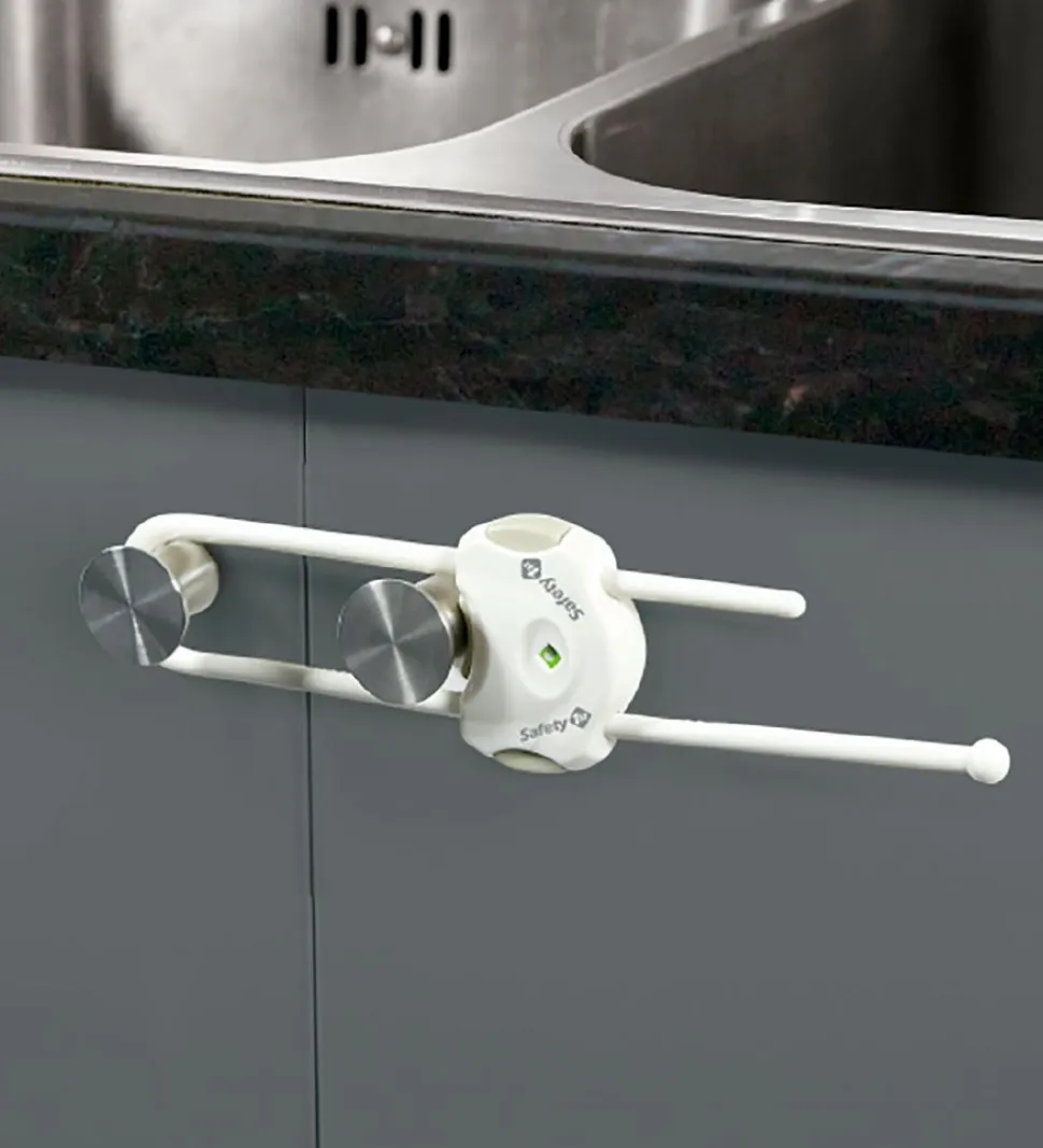 Safety 1st skabslåsen sættes let fast på et skab eller lignende, og fungerer om det er med håndtag eller knopper.