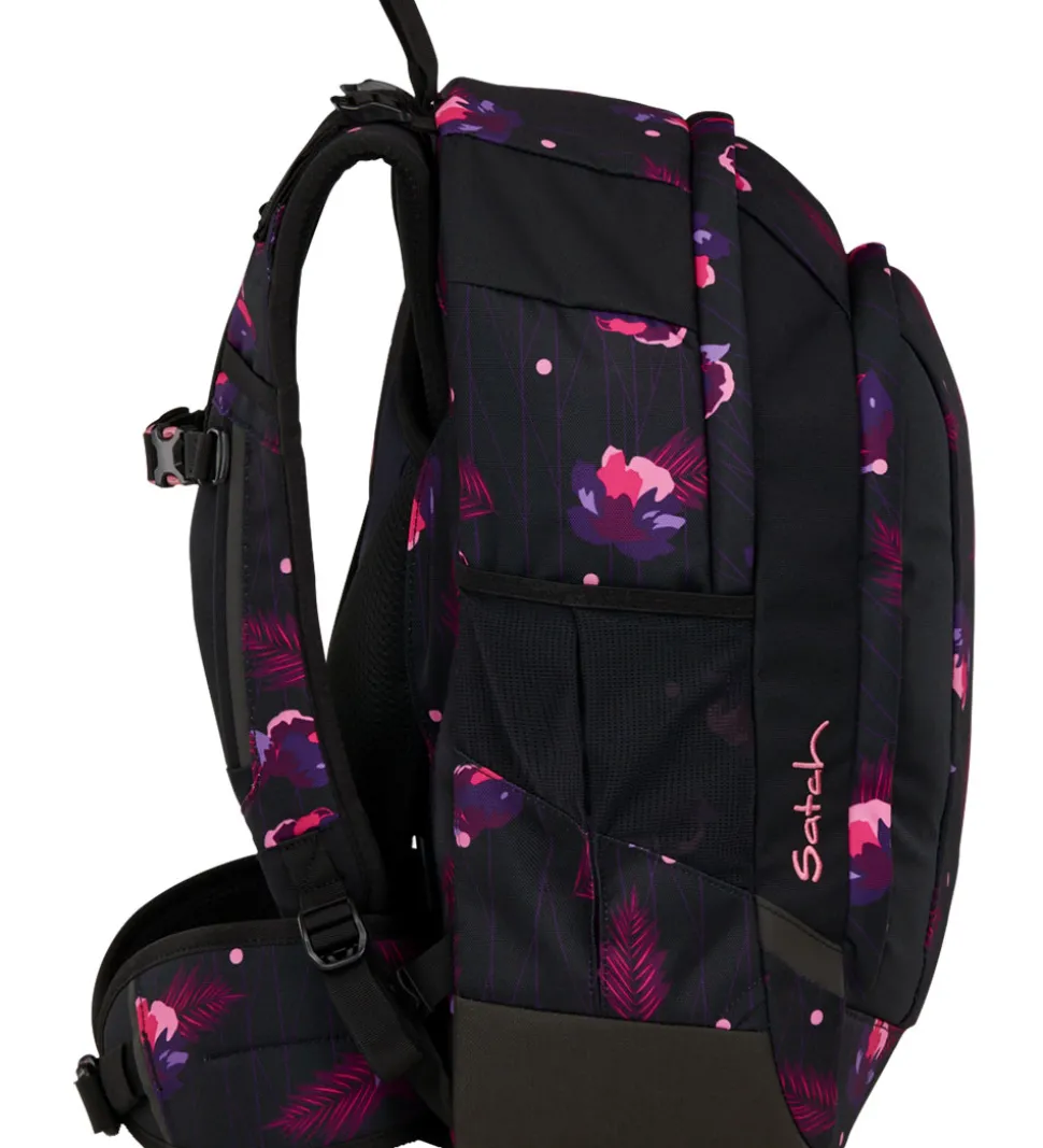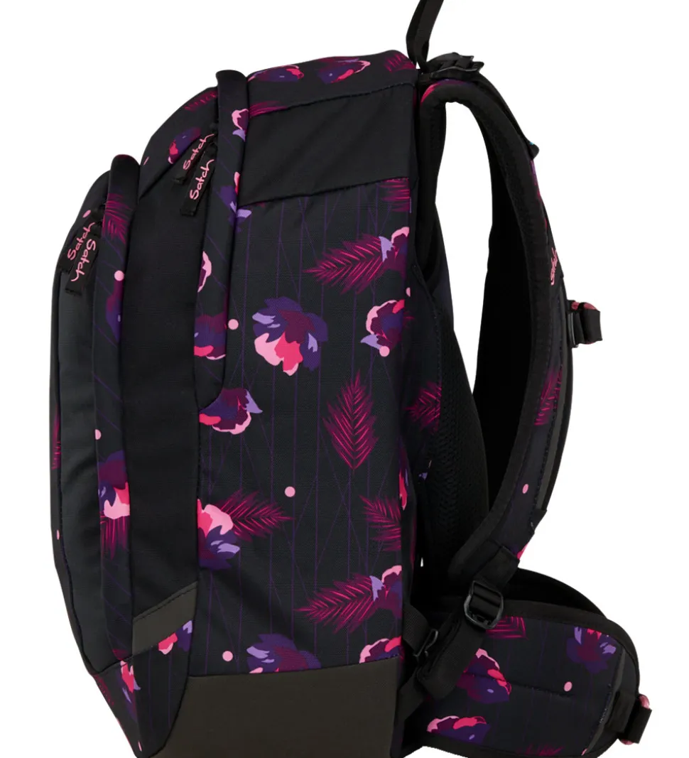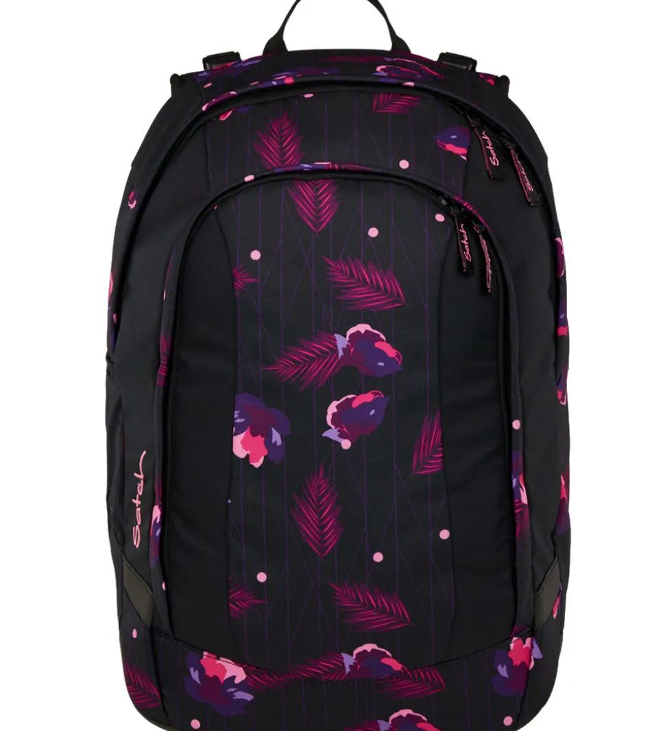 Flot Satch skoletaske i sort med print af blomster og fjer i lilla og rosa farver.