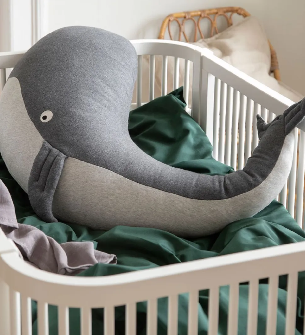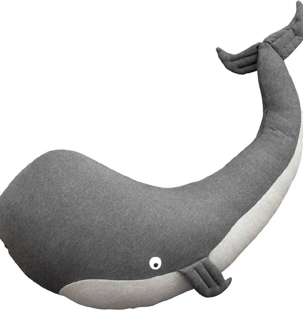 Skøn Sebra ammepude formet som en hval i grå og blå nuancer.