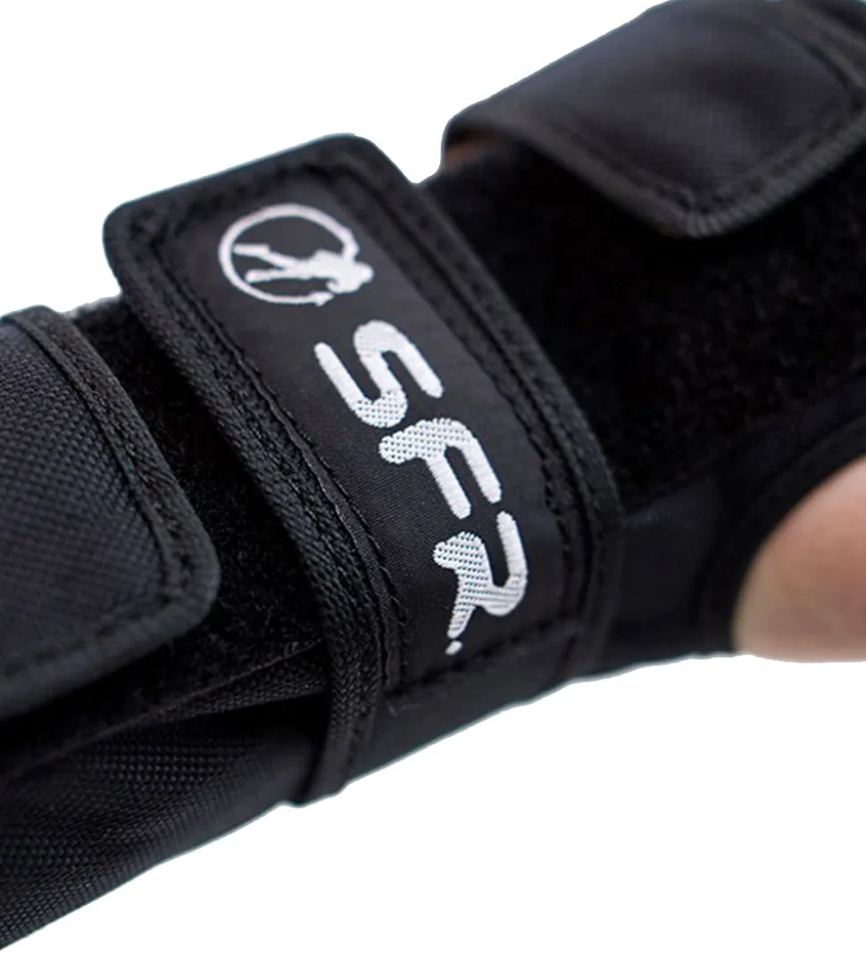 SFR beskyttelsessættet beskytter de udsatte områder på barnet, når det er ude at stå på rulleskøjter, løbehjul, skateboard eller køre på løbecykel. Benet eller armen føres ned gennem åbningen, og så kan de forskellige dele spændes fast med brede elastikker med velcrolukning. Knæ- og albuebeskytterene har en bagside af blød polyester, så remmene ikke irriterer huden.