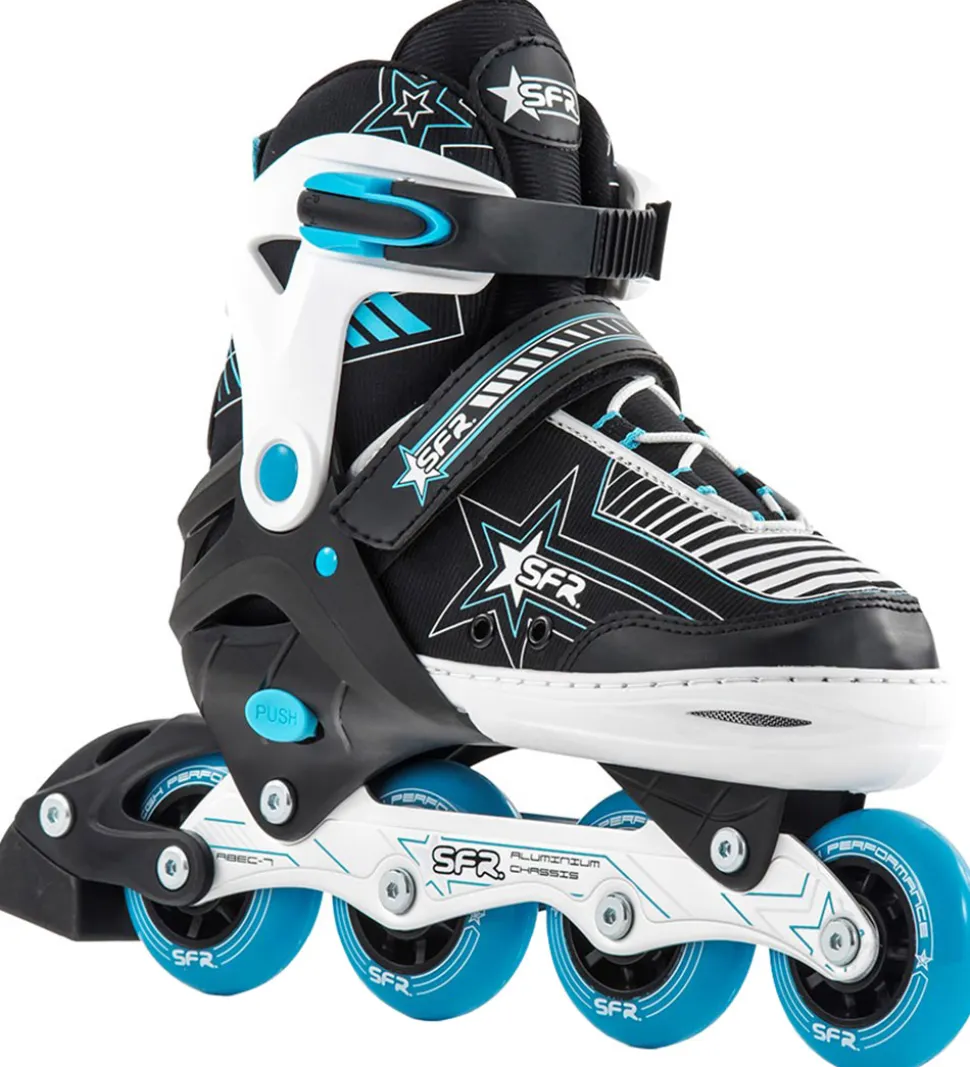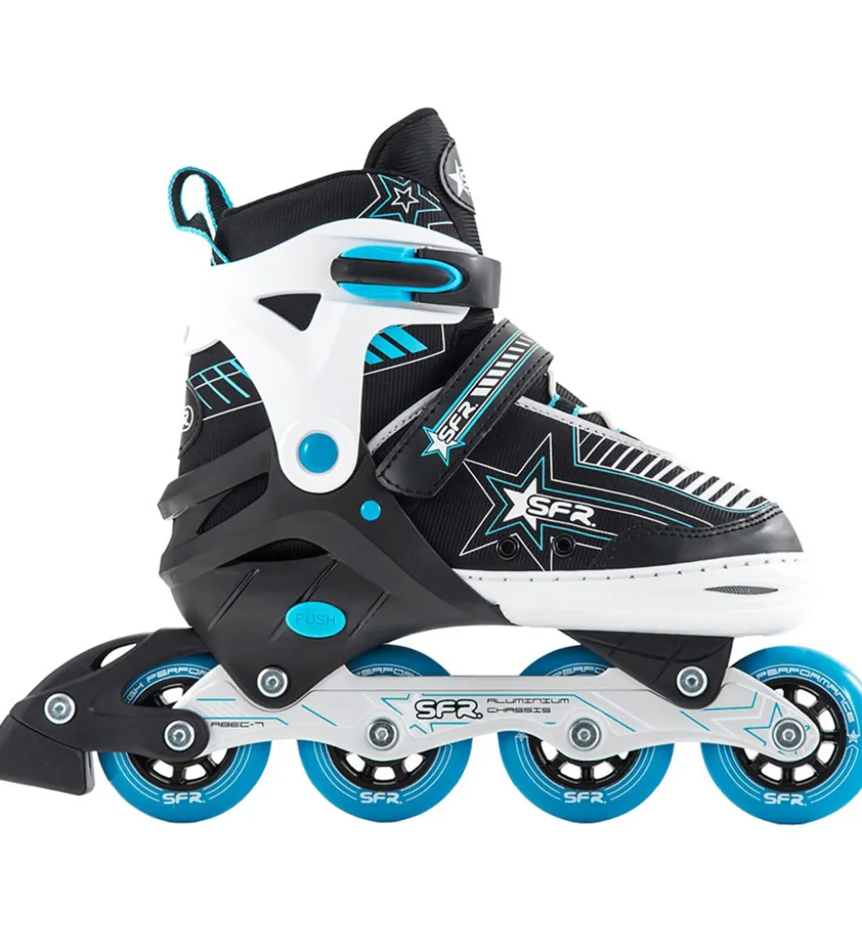 SFR rulleskøjterne er en inliners-model. Rulleskøjterne lukkes foran med en velcrorem og et justerbart plastikspænde. Derudover kan de strammes med snøre over vristen, så de tilpasses til barnets fødder. Bagpå er der en strop, så de er lette at få på. Skaftet har blødt mesh på indersiden og er hårdt udenpå, så rulleskøjterne er behagelige og stabile. Indvendigt er der udtagelige indersåler.