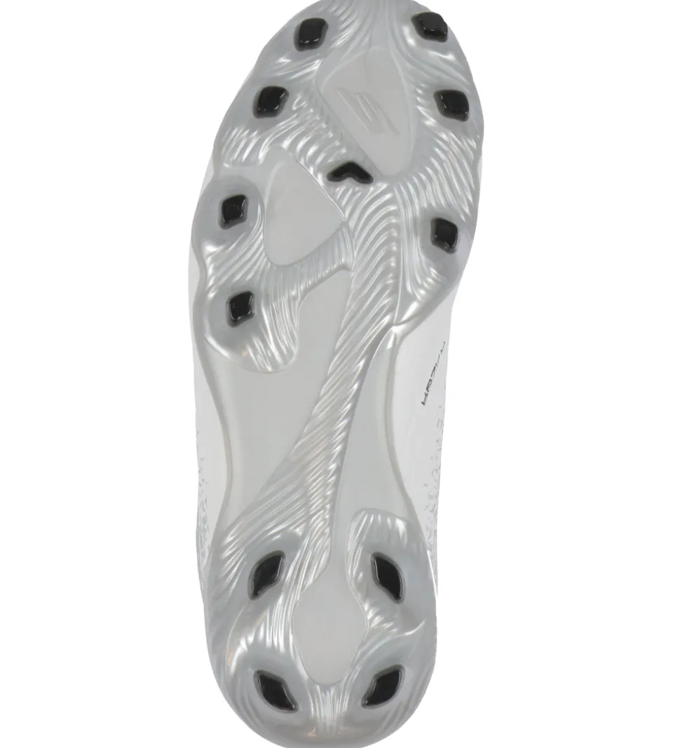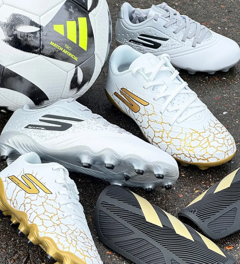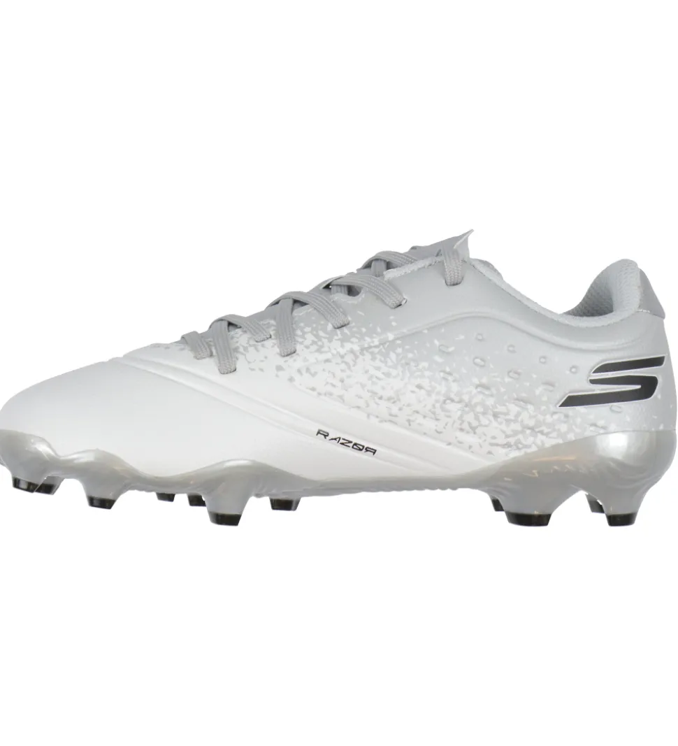 Flotte Skechers fodboldstøvler i hvid med mønster i grå og sølv og et “S” i sort på siderne.