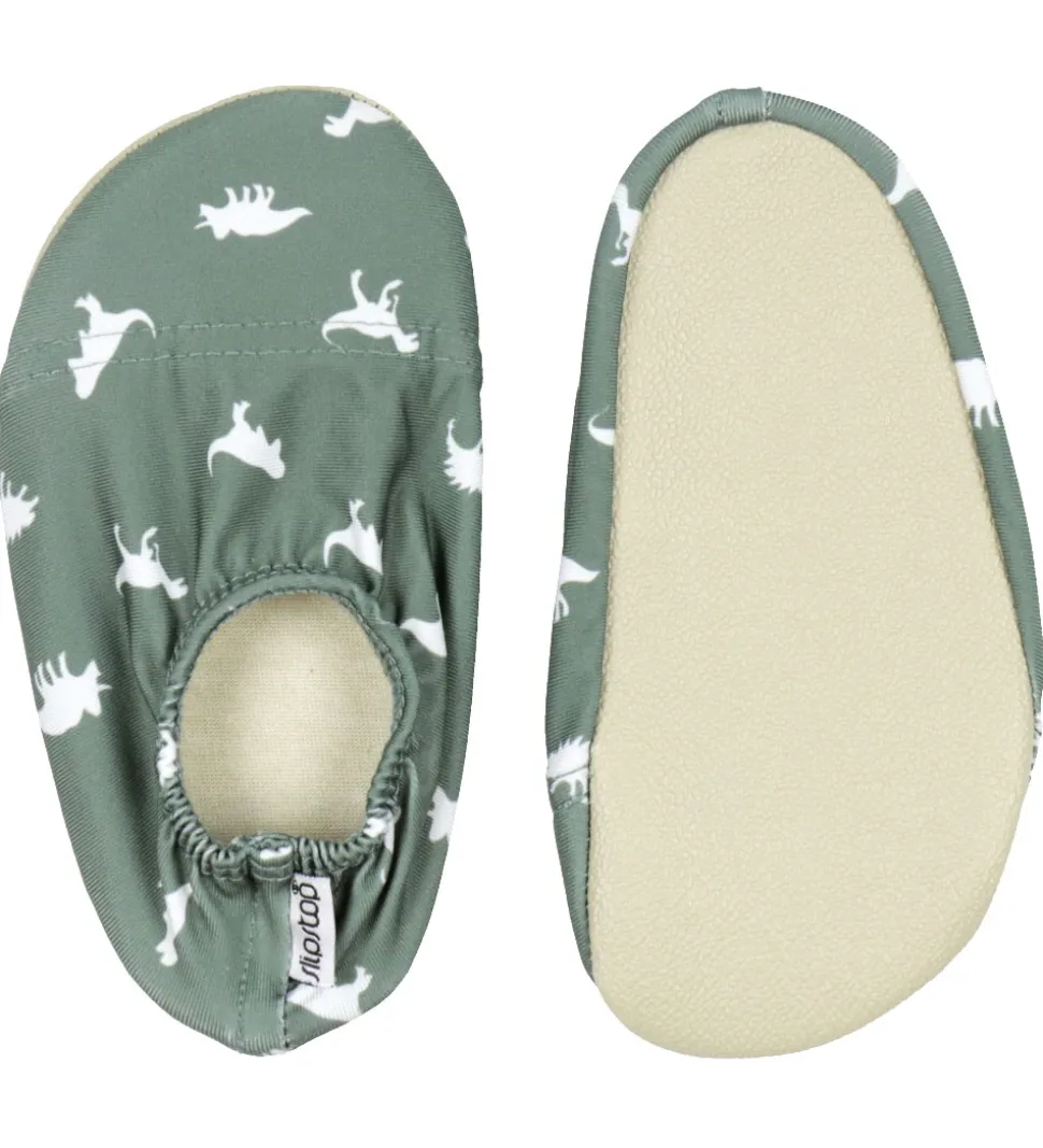 Seje Slipstop badesokker i støvet grøn med print af hvide dinosaurer.