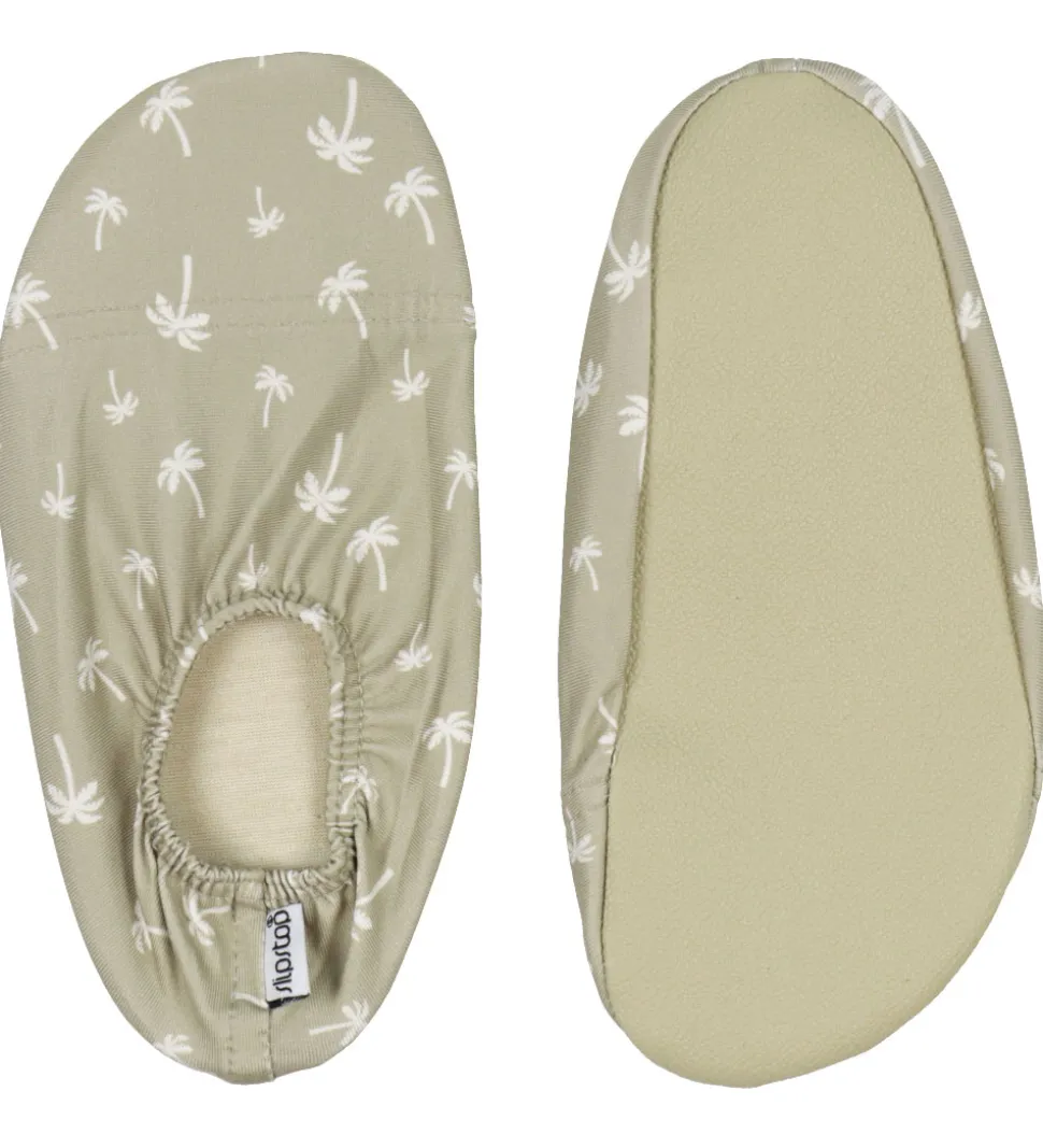 Flotte Slipstop badesokker i beige med print af hvide palmer.