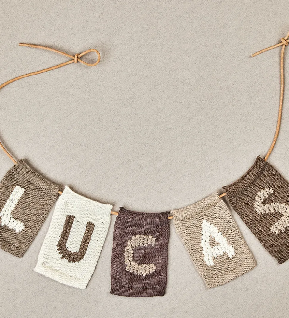 Fin Smallstuff bogstav i mørkebrun med en strikket struktur og bogstavet “C” i lysebrun. Med Smallstuff bogstavet kan du kombinere bogstaver og motiver og danne en sød flagranke med barnets navn.