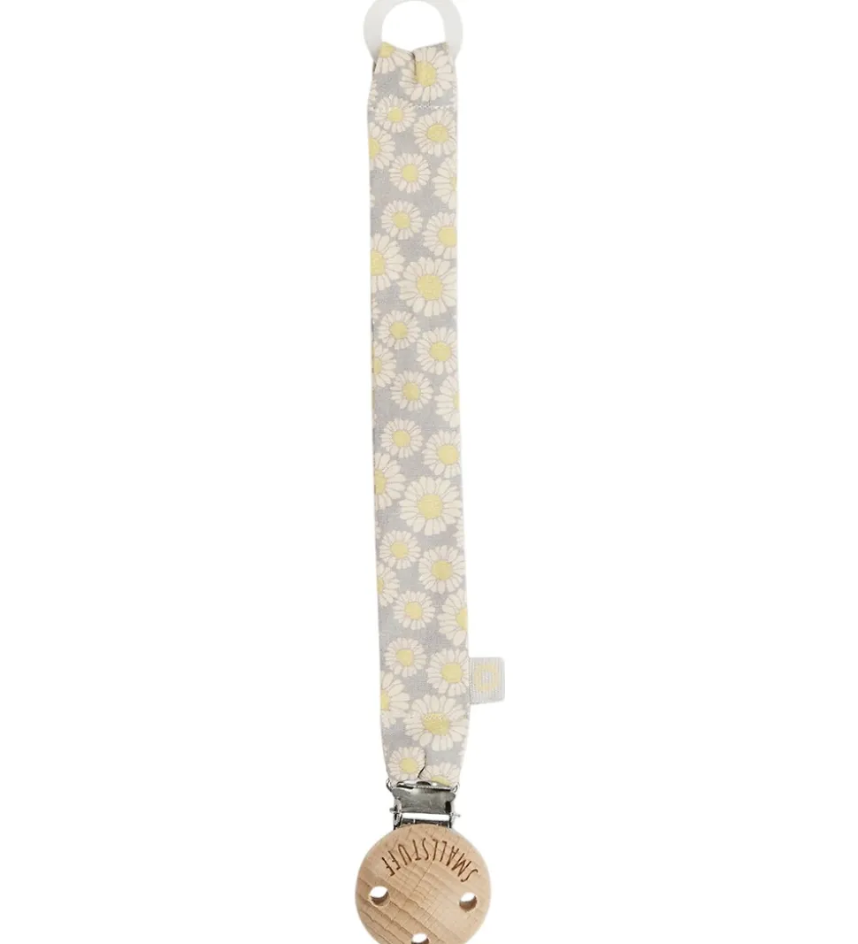 Smallstuff suttesnoren har en rund knop af naturligt træ i den ene ende med en klemme på bagsiden, og i den anden side sidder der en silikonering, som kan sættes omkring en sut.