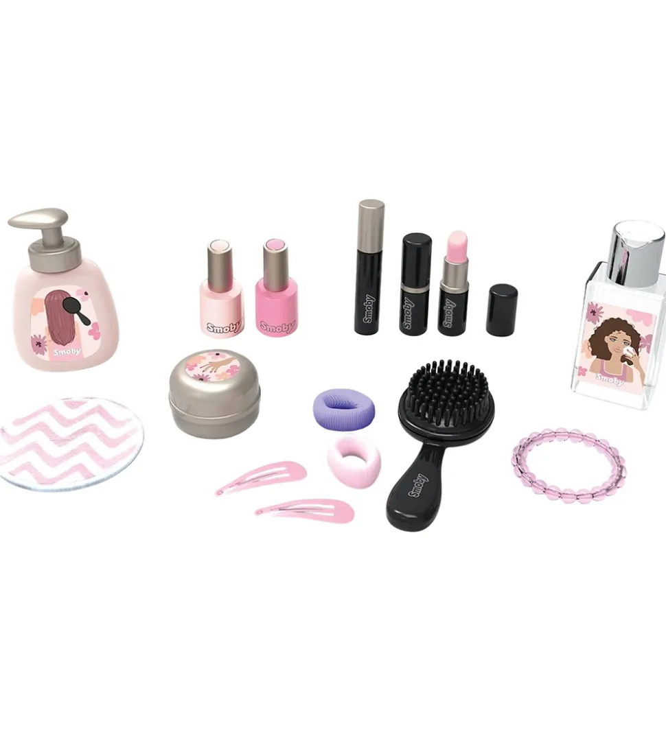 Smoby sminkesættet inkluderer to udadvendte opbevaringsvinger, der gør det nemt at holde alt legekosmetik tæt, et rundt spejl og smykketræer der giver plads til armbånd, ringe, halskæder og andre accessories. Sættet indeholder i alt 15 tilbehørsdele af falsk legekosmetik og tomme beholdere.
