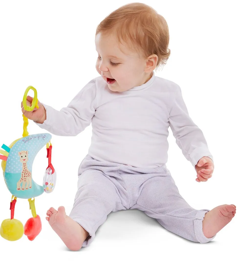 Sophie la Giraffe musikuroen spiller en dejlig vuggevise, når man trækker den snor, som musikuroen også kan hænge i ved hjælp af en c-ring. Fra halvmånen hænger flere aktivitetslegetøj, som i øvrigt kan tages af. Der er både en rangle, et pivedyr og en raslering.