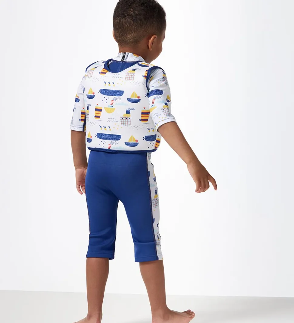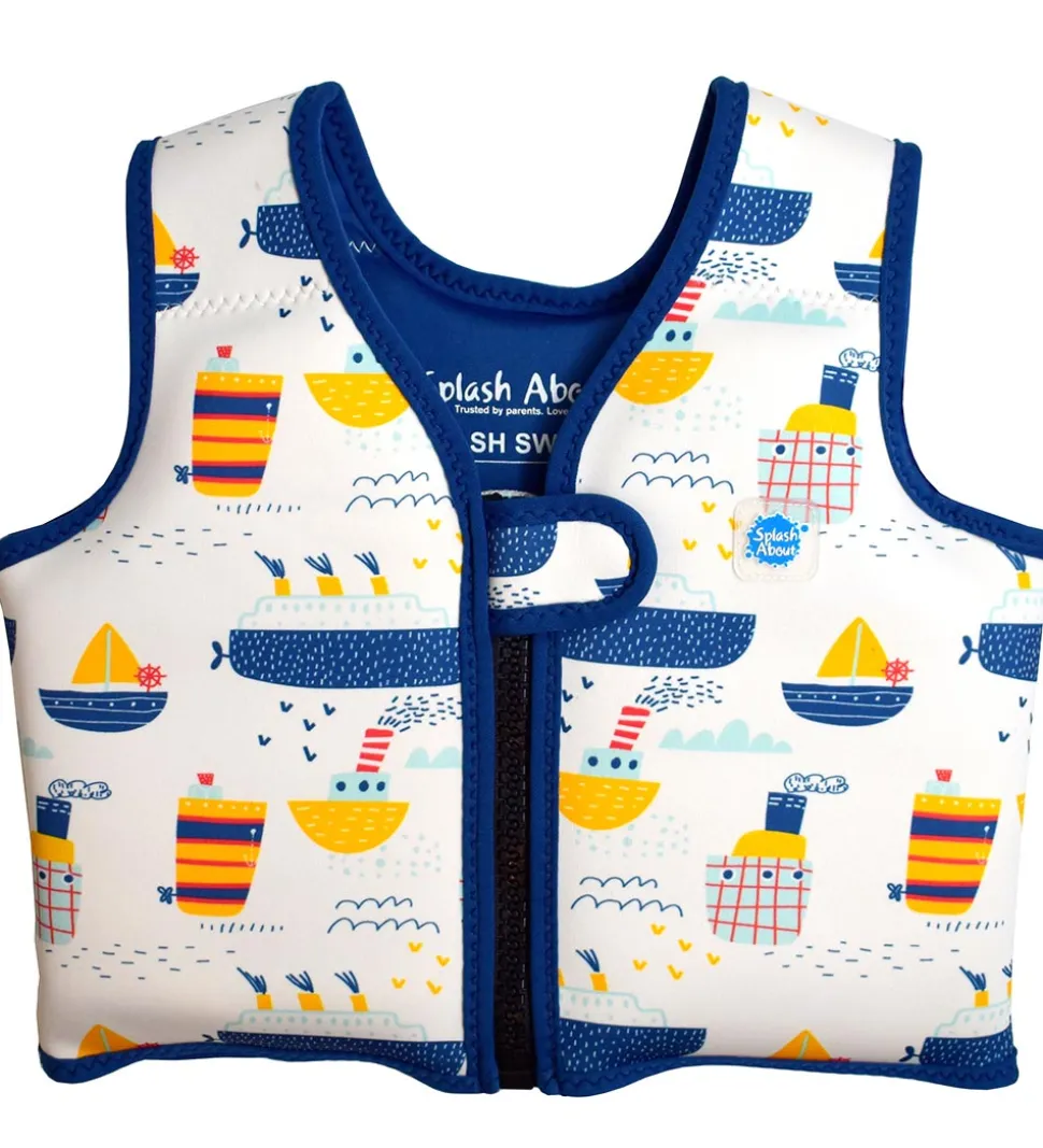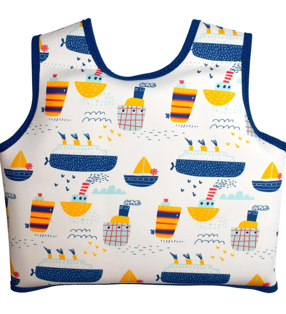 Sej Splash About svømmevest i hvid med navy kanter. Svømmevesten er med allover print af forskellige både og bølger i et hav af farver. På venstre bryst er der et logo i gummi.