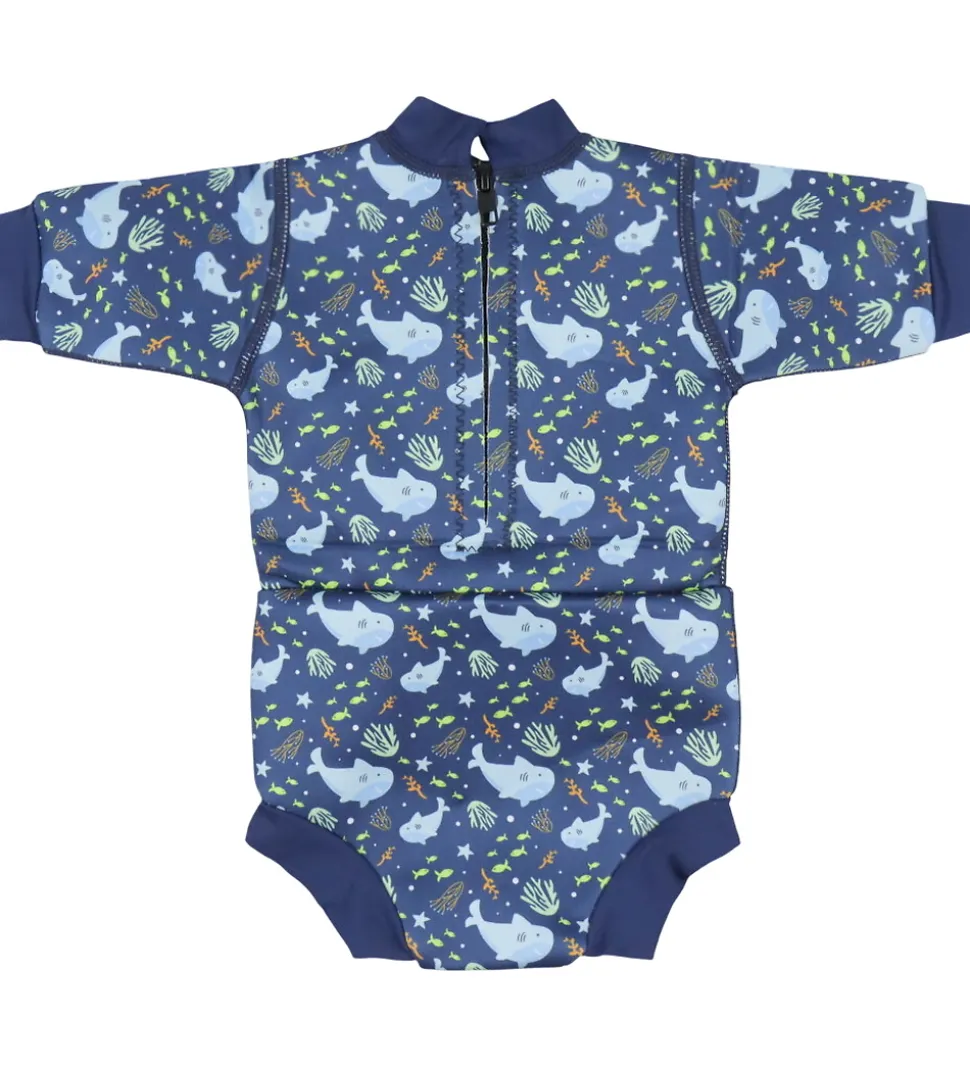Splash About våddragten har halvlange ærmer, og den åbnes bagpå med en lynlås i nakken. De praktiske Splash About blebadebukser er indsyet i dragten, og de giver en god sikkerhed mod uheld. Blebadebukserne holder tæt og kan bruges uden en almindlig ble. Våddragten har praktiske elastikkanter i alle åbninger, så den bliver siddende som den skal.