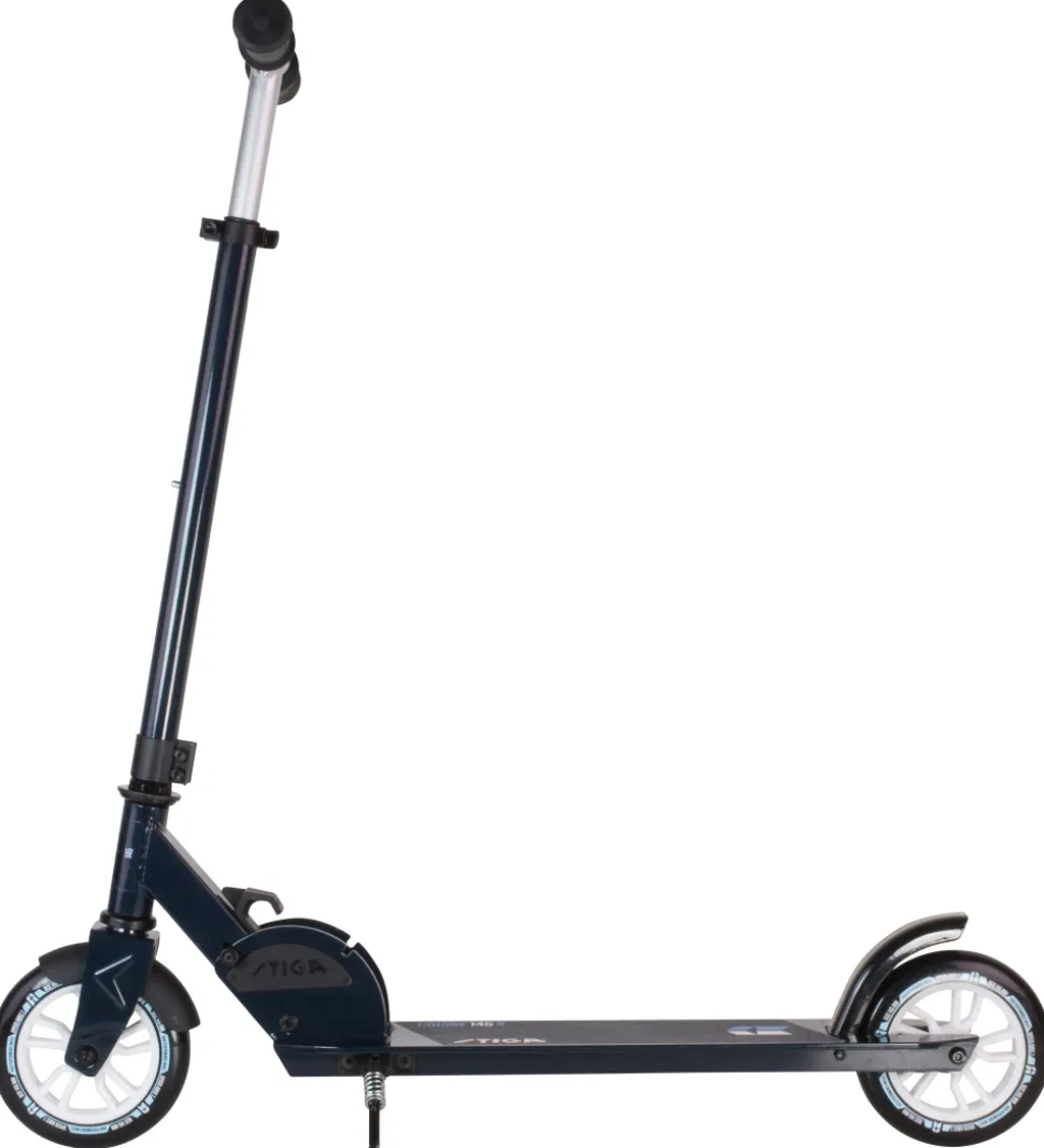 Smart Stiga løbehjul i en mørkeblå aluminium/stål-ramme, der kan foldes sammen.