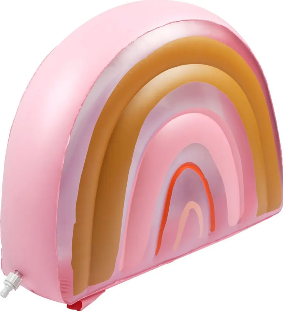 Sej SunnyLife sprinkler, der har form som en regnbue i rosa, karrygul og rød.