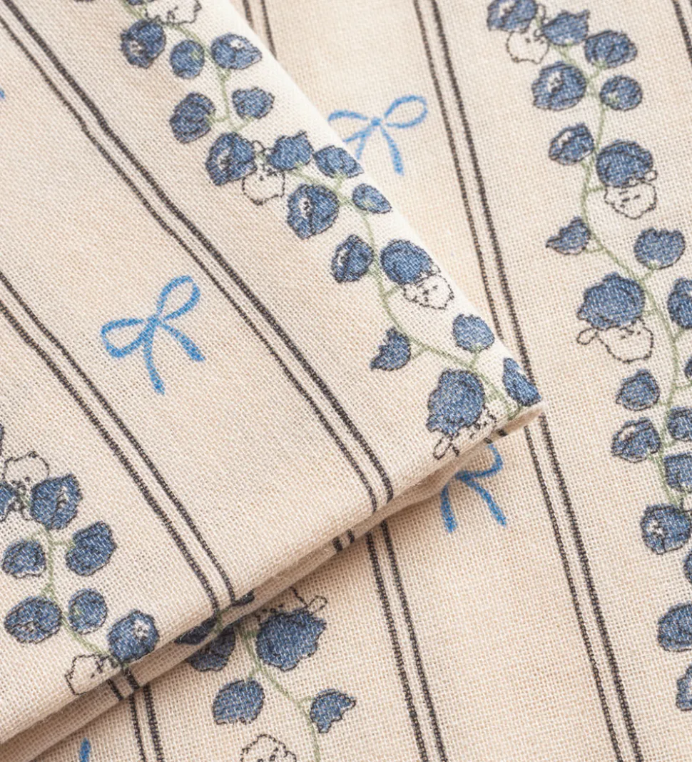 Fint That’s Mine babysvøb i cremehvid med et stribet mønster af blomster og sløjfer i blå nuancer. Svøbet har en lækker musselin-struktur.