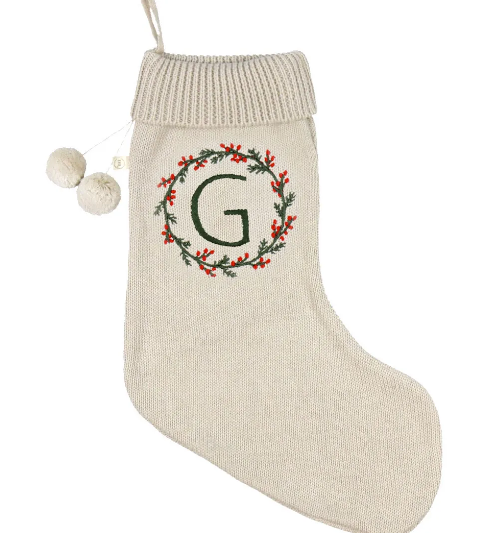 Hyggelig That’s Mine julesok i beige strik med et broderet, grønt “G” og en broderet julekrans i grøn med røde bær på skaftets ene side. Der er også to pomponer i snor ved julesokken åbning.