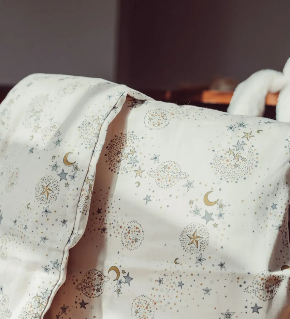 Sødt That’s Mine sengetøj i lysebeige med et flot stjerneprint i blå, gule og brune nuancer.