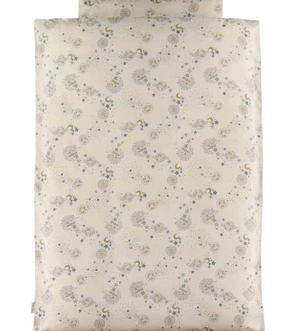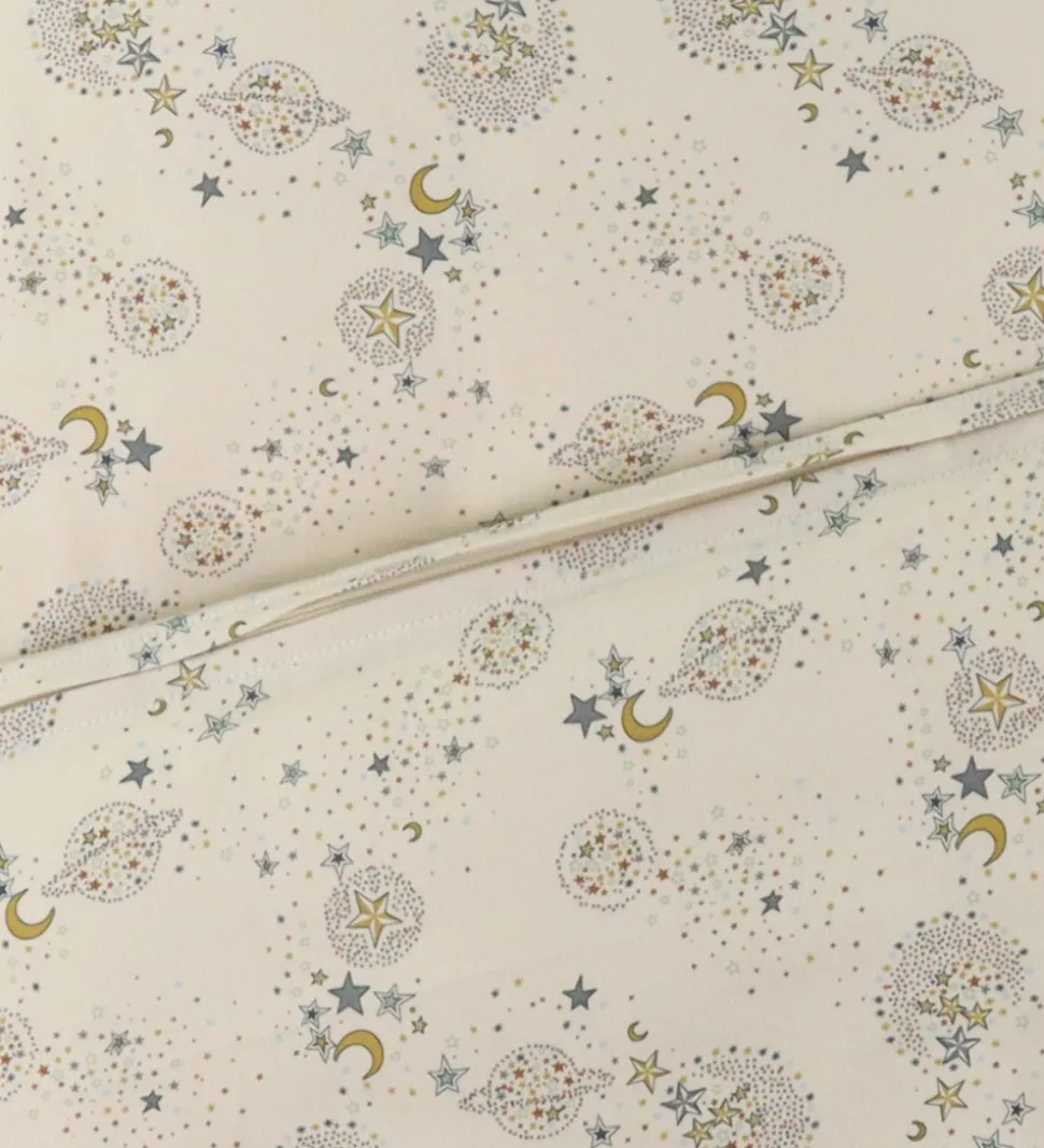 Lækker That’s Mine sengetøj i lysebeige med et flot sterjneprint i blå, gule og brune nuancer.