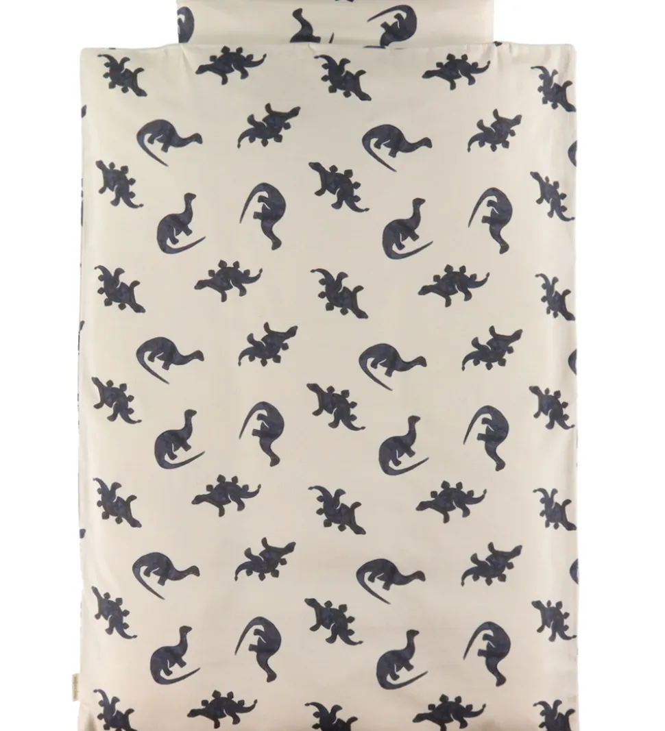 Smart That’s Mine sengetøj i lysebeige med et flot dinosaurprint i mørkeblå nuancer.