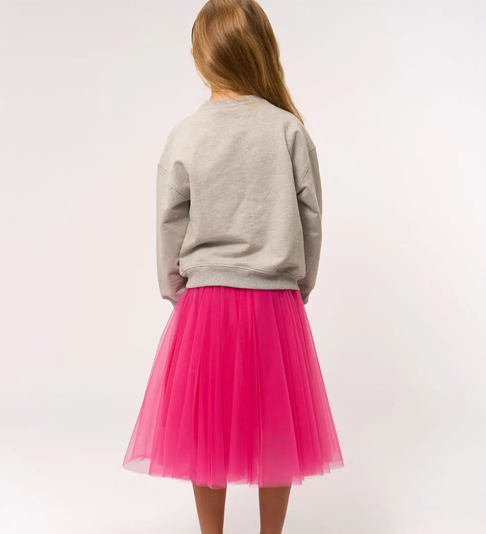 Stilfuld The New tylnederdel i en iøjnefaldende pink farve. The New nederdelen består af to lag, et glatvævet underskørt i bomuld og et ydre lag i let og luftig tyl, der skaber et flot fald. Den elastiske talje sikrer en god pasform og kan justeres indvendigt med knapper.