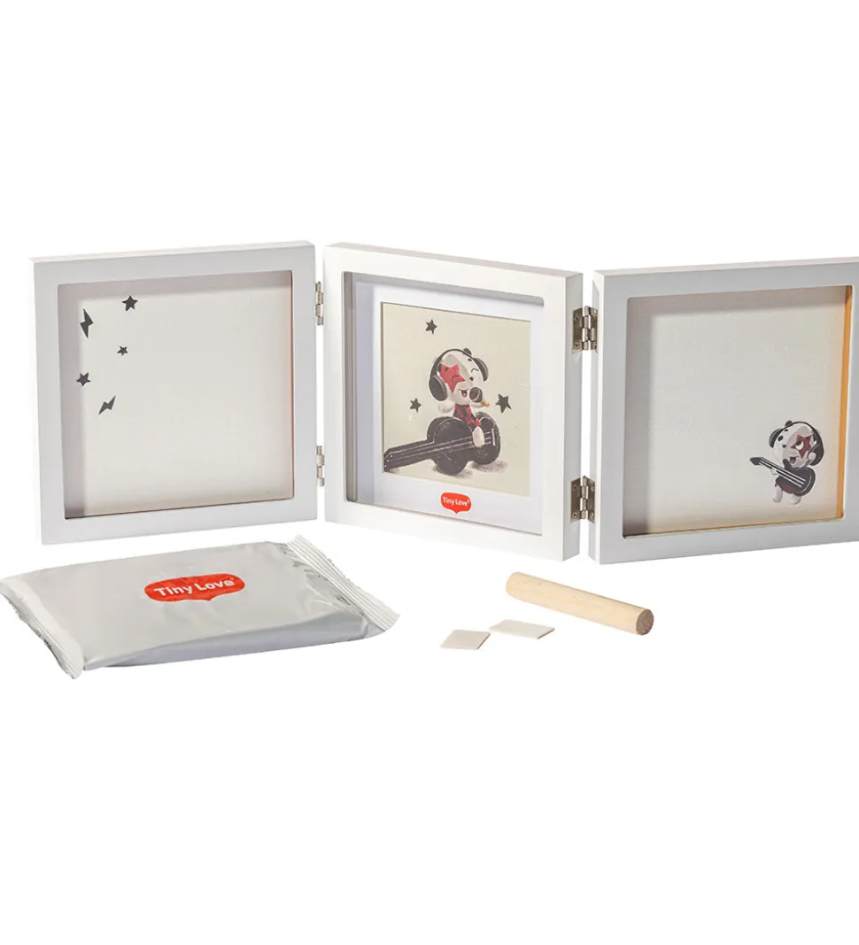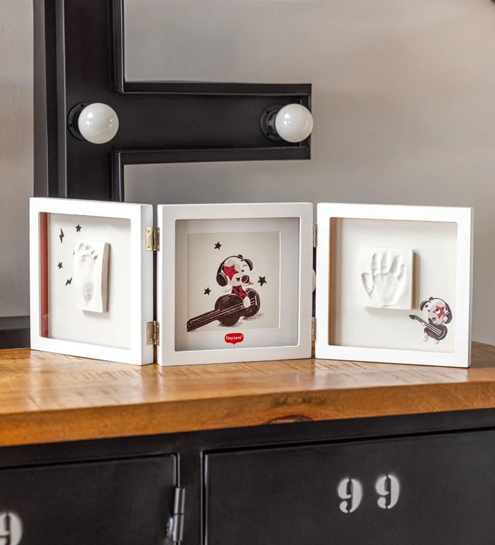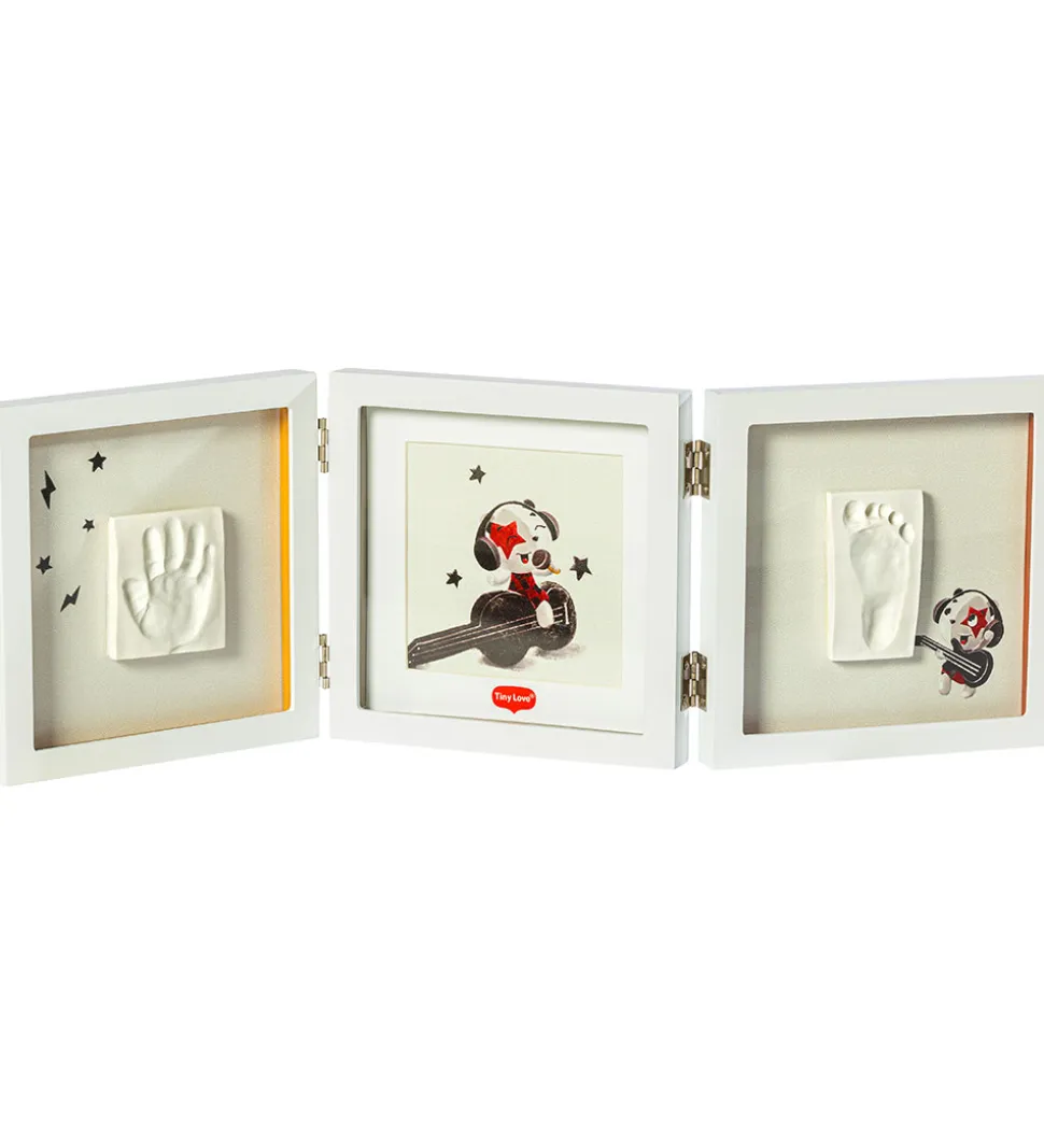 Smart Tiny Love aftryksæt med en triple billedramme i hvid. Tiny Love sættet indeholder alt, der skal bruges til at lave et hånd- og fodaftryk af din baby. Med sættet kan du forevige minder af din baby, og med den medfølgende billedramme kan du lade aftrykket stå til pynt i hjemmet eller bruge det som en personlig gave.