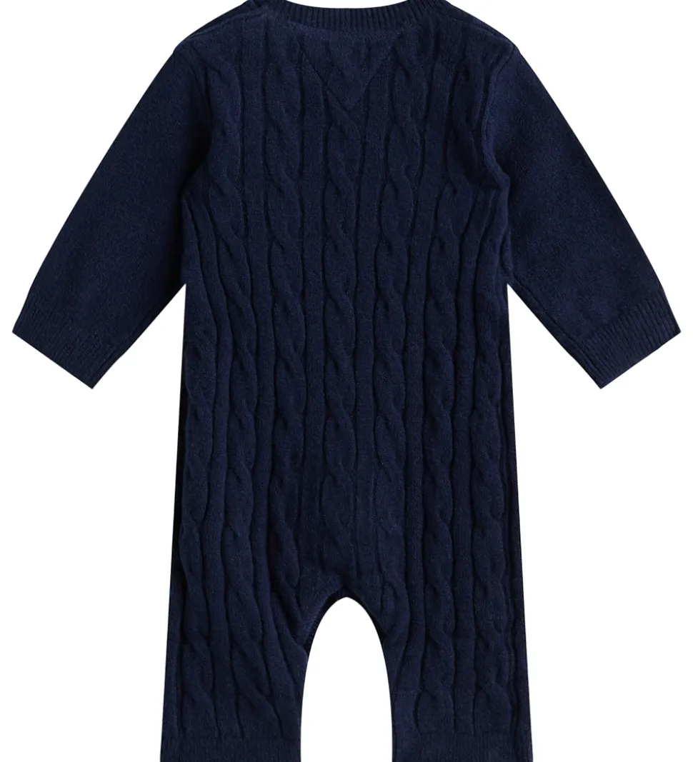 Elegant Tommy Hilfiger heldragt i navyblå med et flot kabelstrikmønster. Tommy Hilfiger heldragten har en rund halsudskæring med knapper ved venstre skulder. Den har lange ærmer og lange ben med knapper mellem benene.