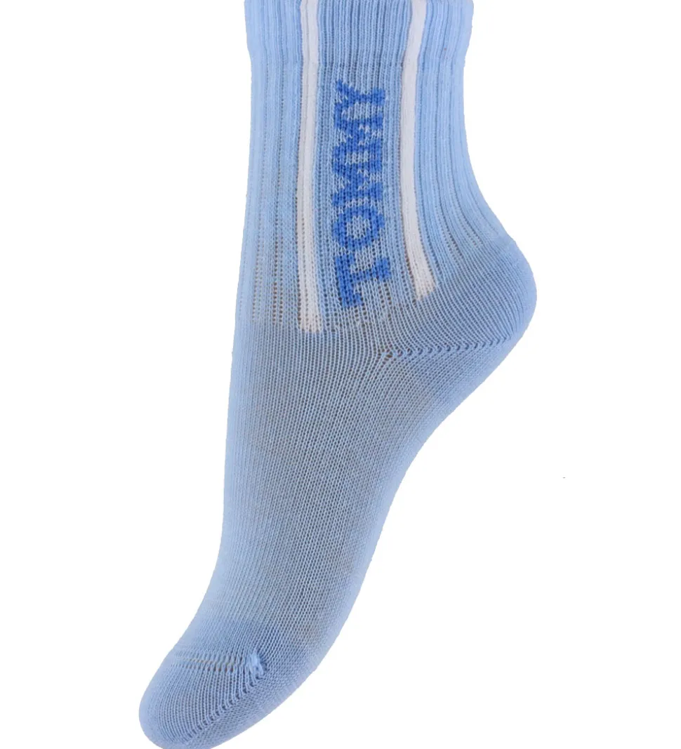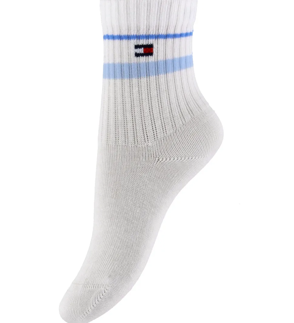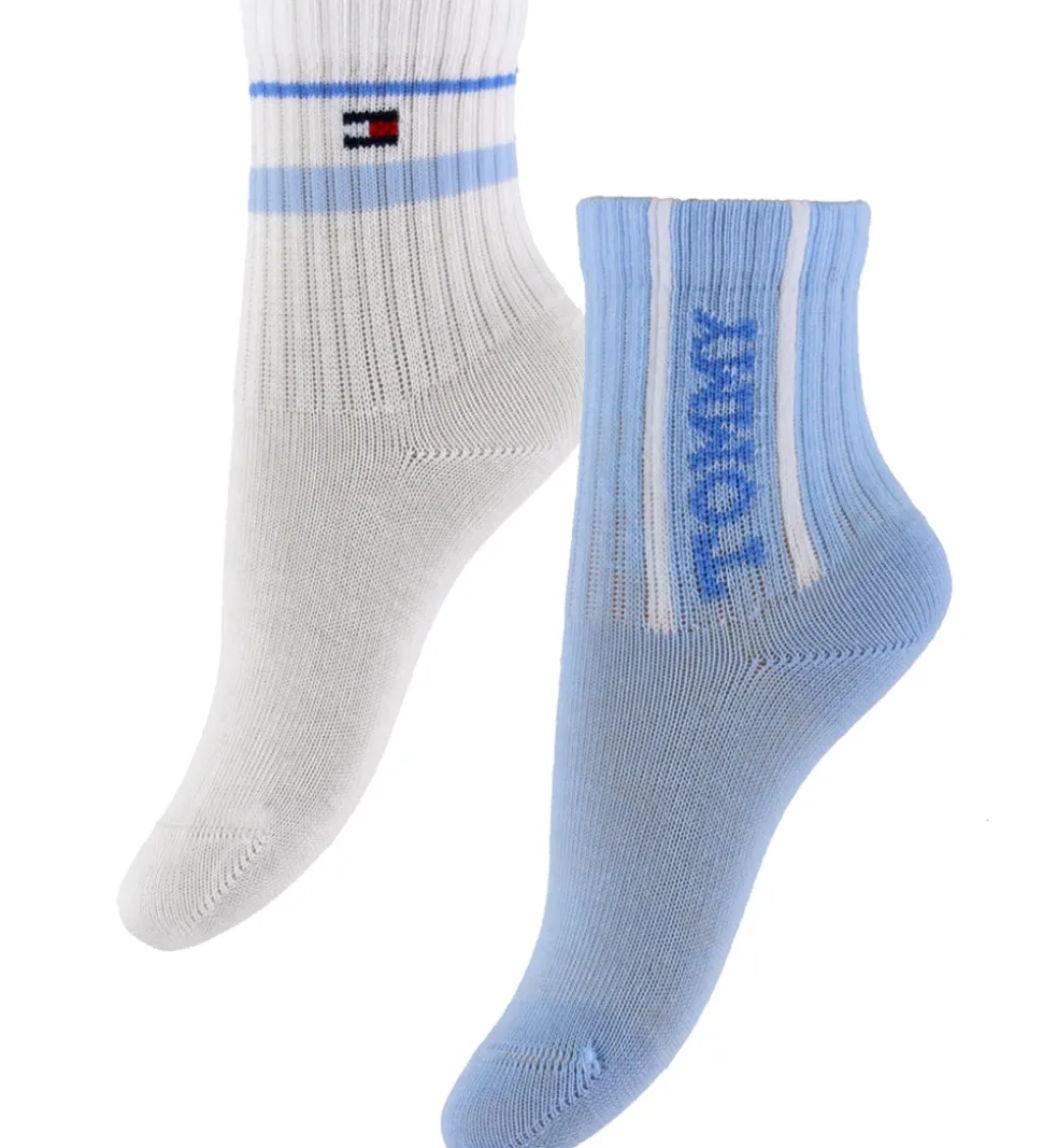 Stilfulde Tommy Hilfiger strømper i en sampak med to par. Det ene par er hvidt med et blåt bånd og det ikoniske Tommy Hilfiger logo. Det andet par er lyseblåt med teksten “Tommy” i mørkeblå. Begge modeller har ribstruktur på skaftet.