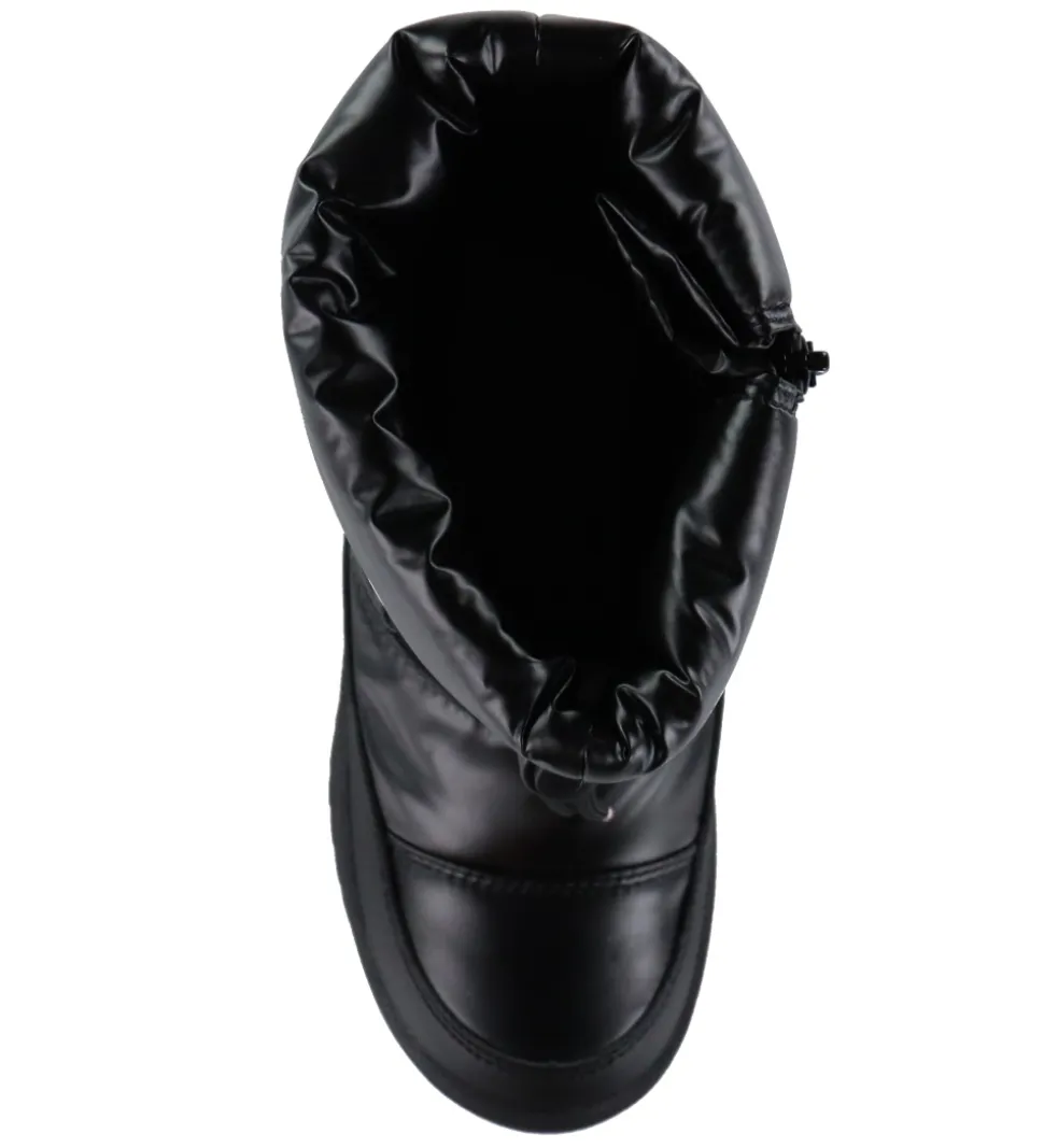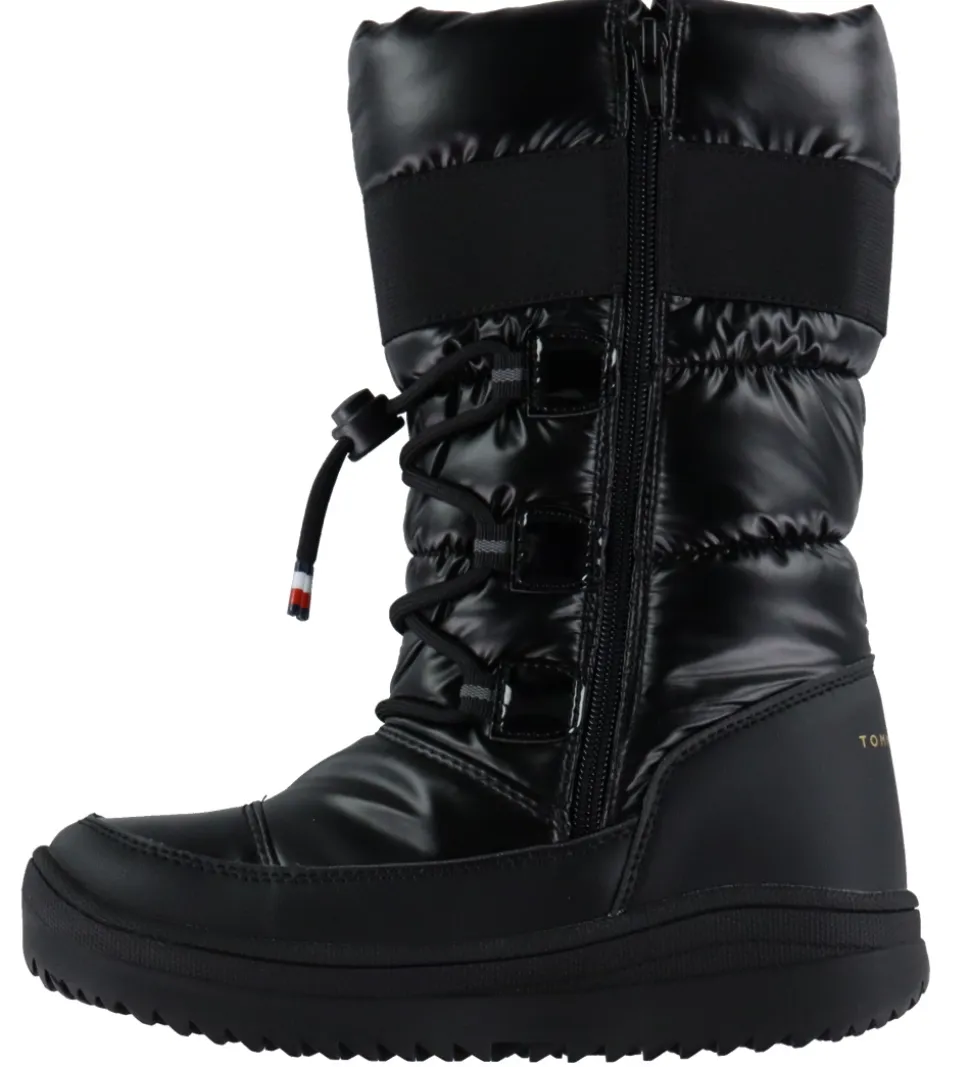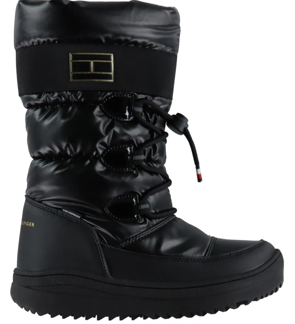 Smarte Tommy Hilfiger vinterstøvler i sort imiteret læder og tekstil. Vinterstøvlerne har en blank overflade og logo på ydersiden samt på hælen.