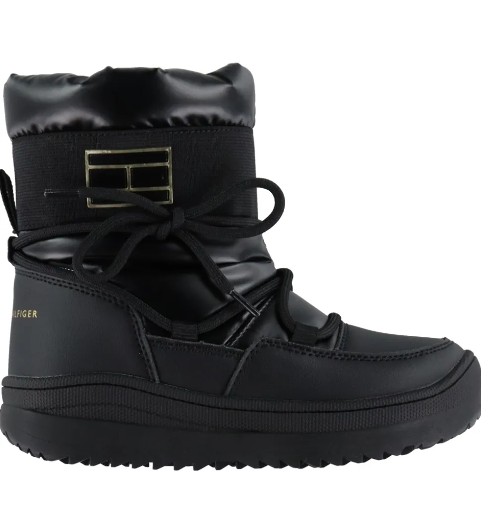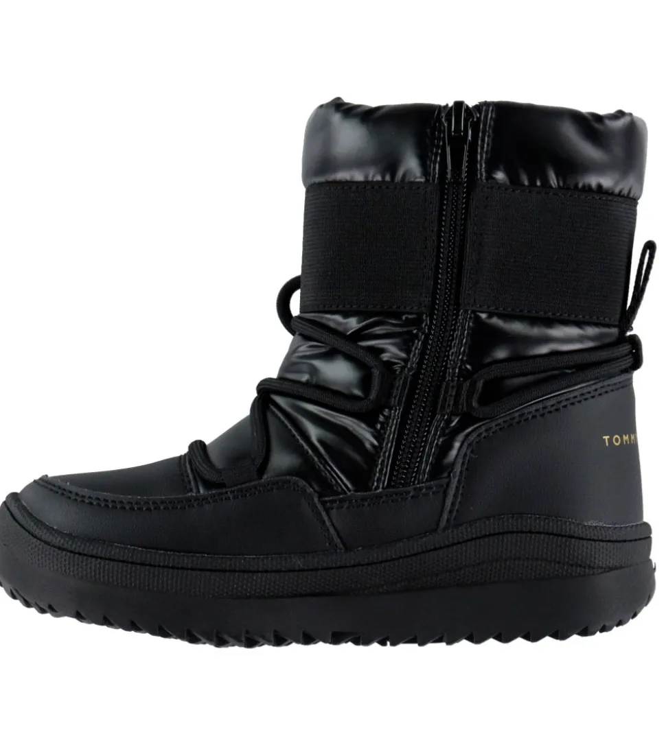 Stilfulde Tommy Hilfiger vinterstøvler i sort imiteret læder og tekstil. Vinterstøvlerne har en blank overflade og logo på ydersiden samt på hælen.