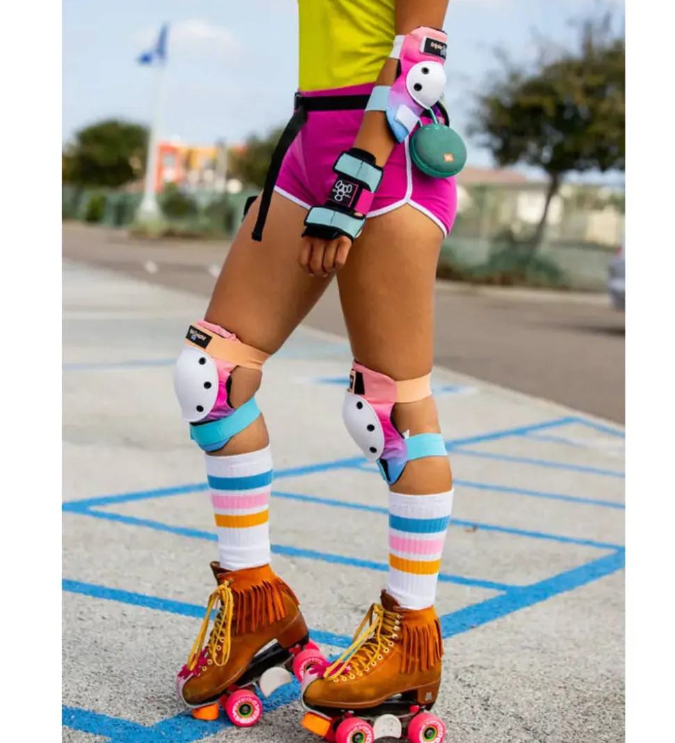 Sejt Triple Eight beskyttelsessæt i et farvemiks af pink, rosa, lilla og lyseblå og med hvide kapler.