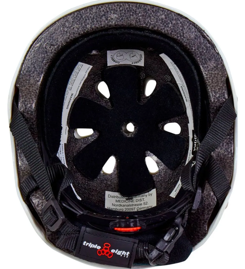 Triple Eight hjelmen spændes under hagen med justerbare remme og et praktisk plastikspænde, som er udformet, så små fingre ikke kommer i klemme. Hjelmen kan ligeledes spændes ind i nakken.