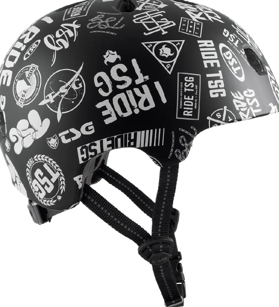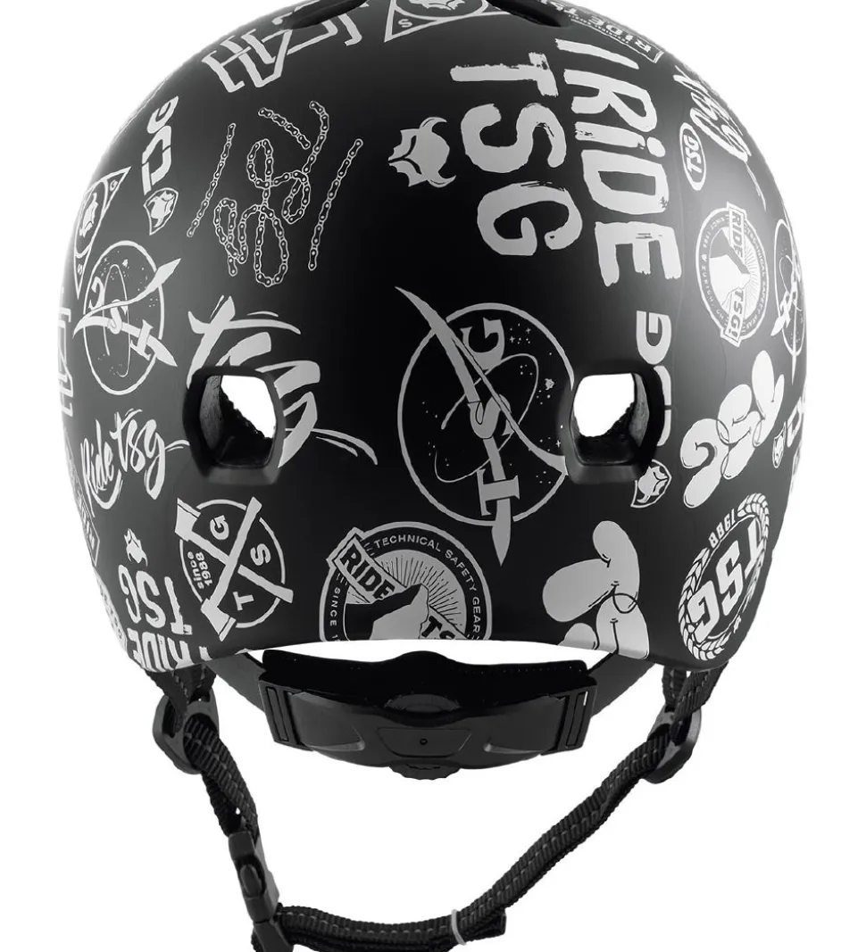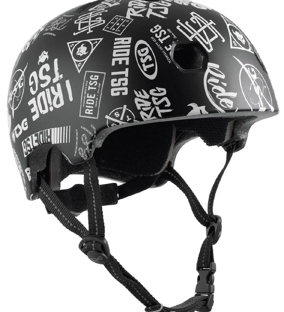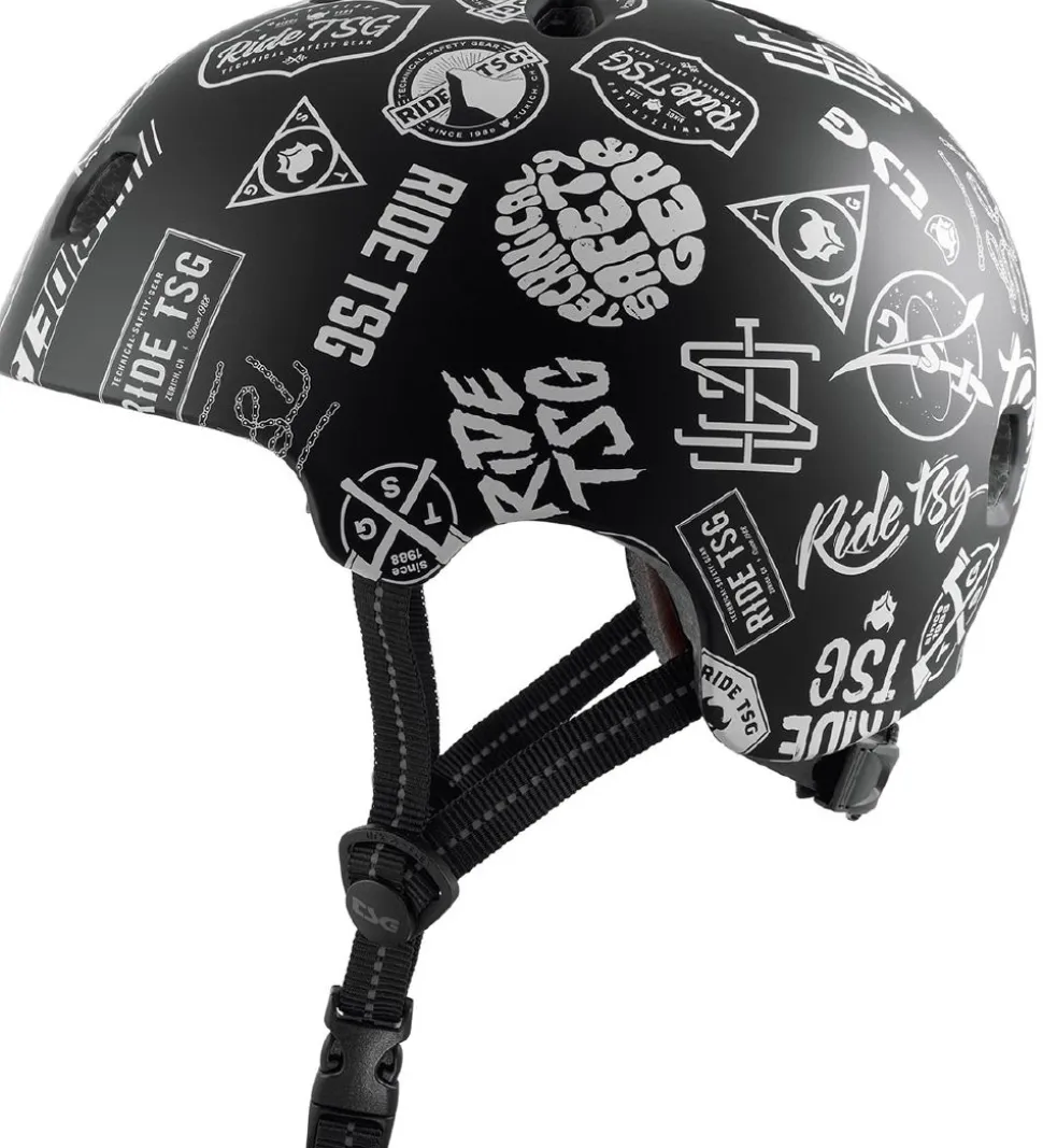 Flot TSG cykelhjelm i sort med et alloverprint af forskellige logoer i hvid.