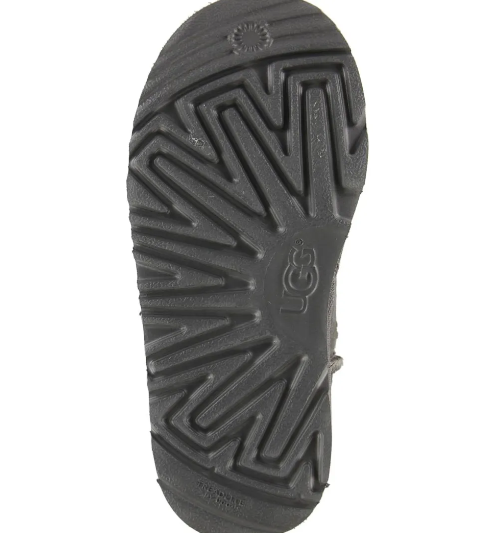 Lækre UGG bamsestøvler i grå med flotte udvendige syninger. På hælkappen er der også et lille UGG-logo i grå.