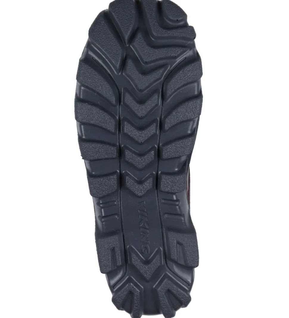 Praktiske Viking termostøvler i mørkelilla og grå med en ru og glat struktur skiftevis på støvlen.