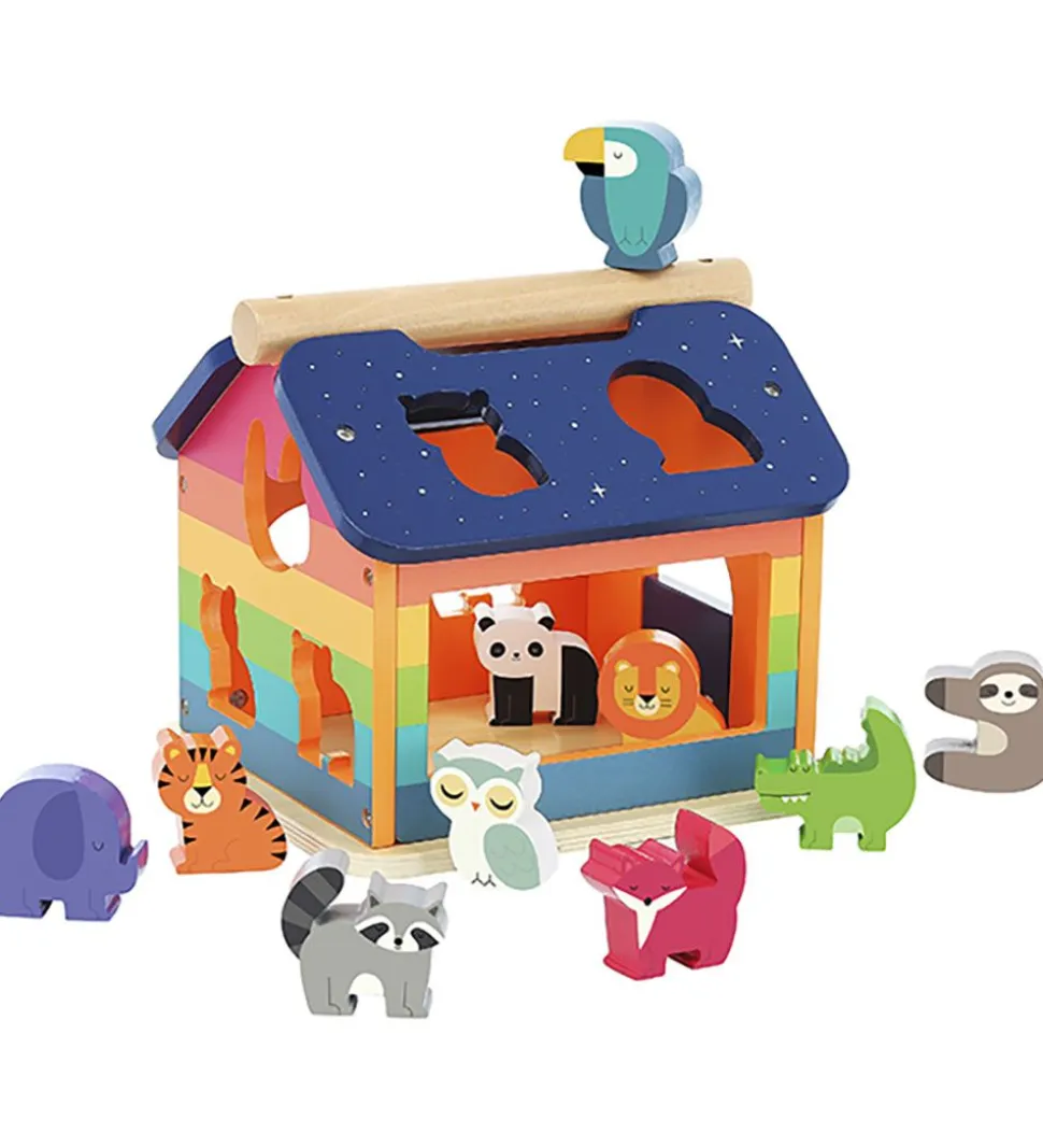 Yndig Vilac puttekasse der forestiller et hus i træ med regnbuer for enden. Taget er navy med hvide stjerner, og klodserne er med dyr.